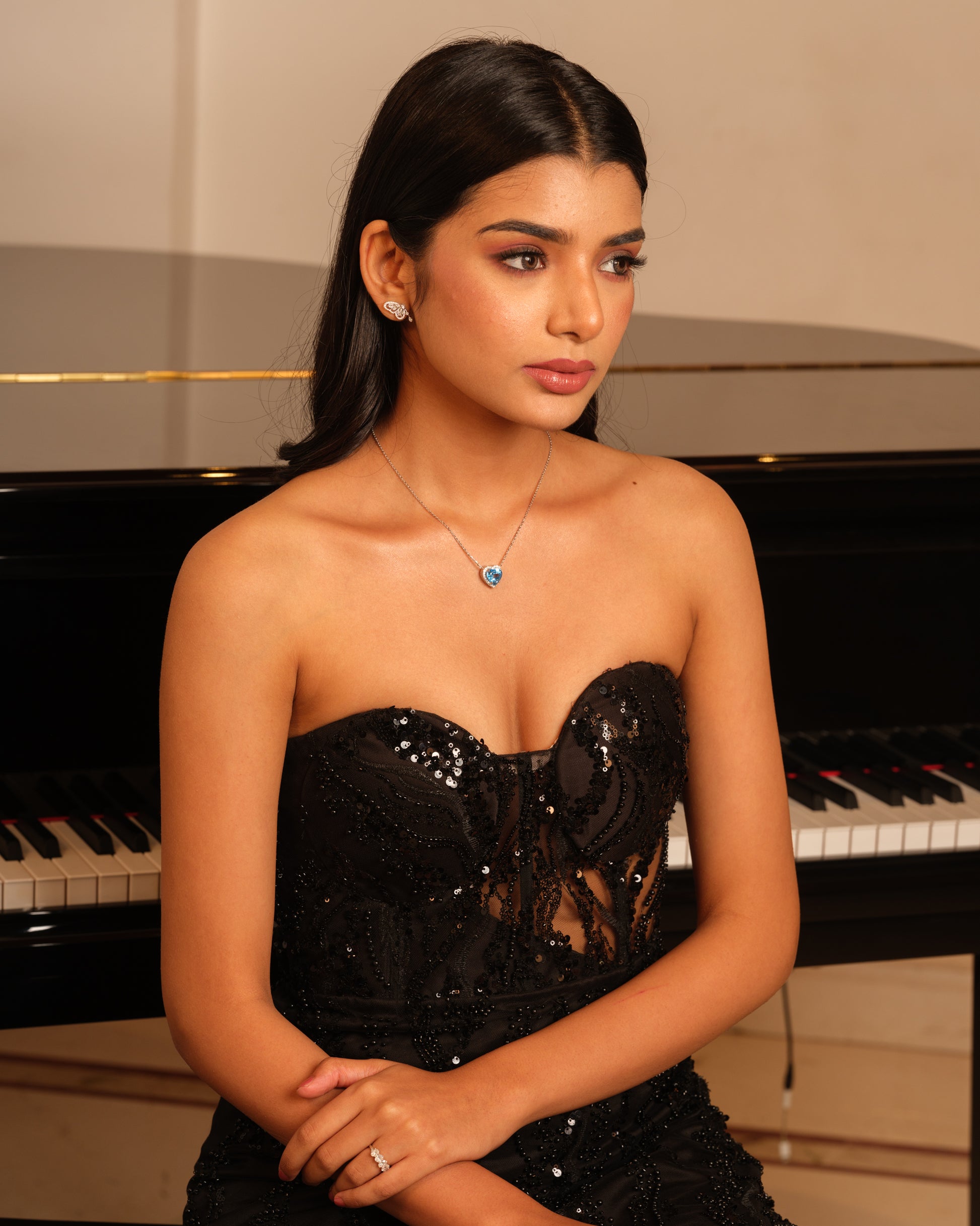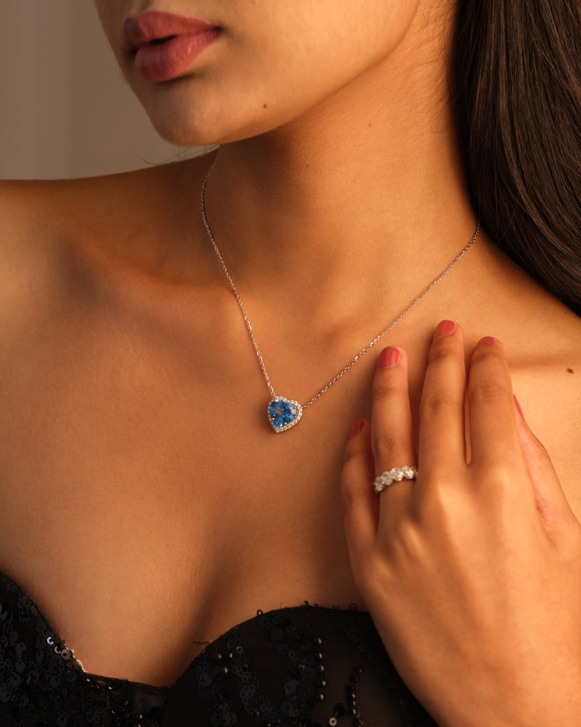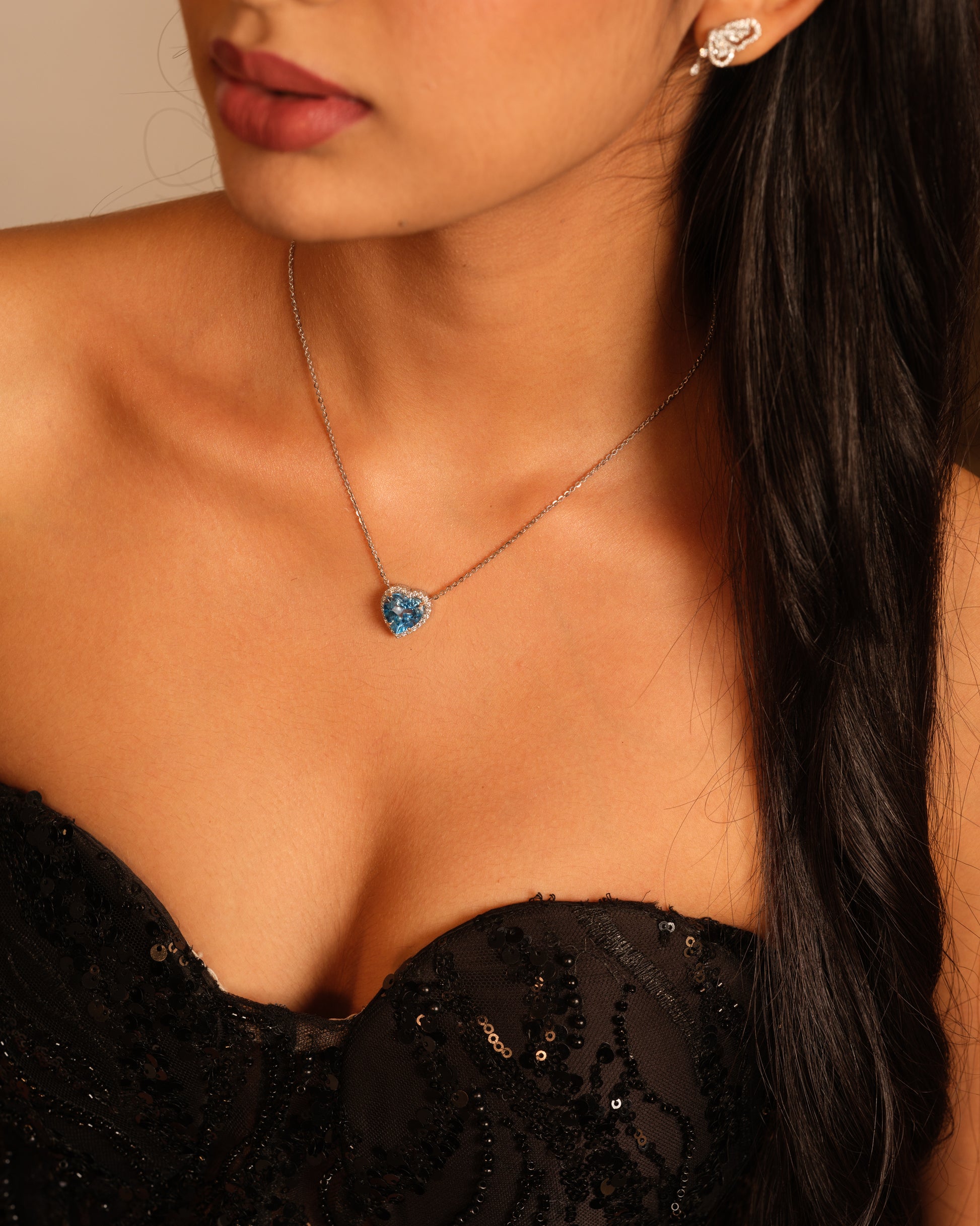 This breathtaking necklace features a heart-shaped blue topaz at its centre, surrounded by a radiant diamond halo. The design, inspired by the Art Nouveau period, showcases flowing, organic curves and intricate detailing. The striking blue topaz symbolises the deep, timeless beauty of the sea, while the diamonds add a touch of refined luxury. This piece captures the romantic spirit and grandeur of a bygone era, making it a truly unforgettable statement of sophistication.