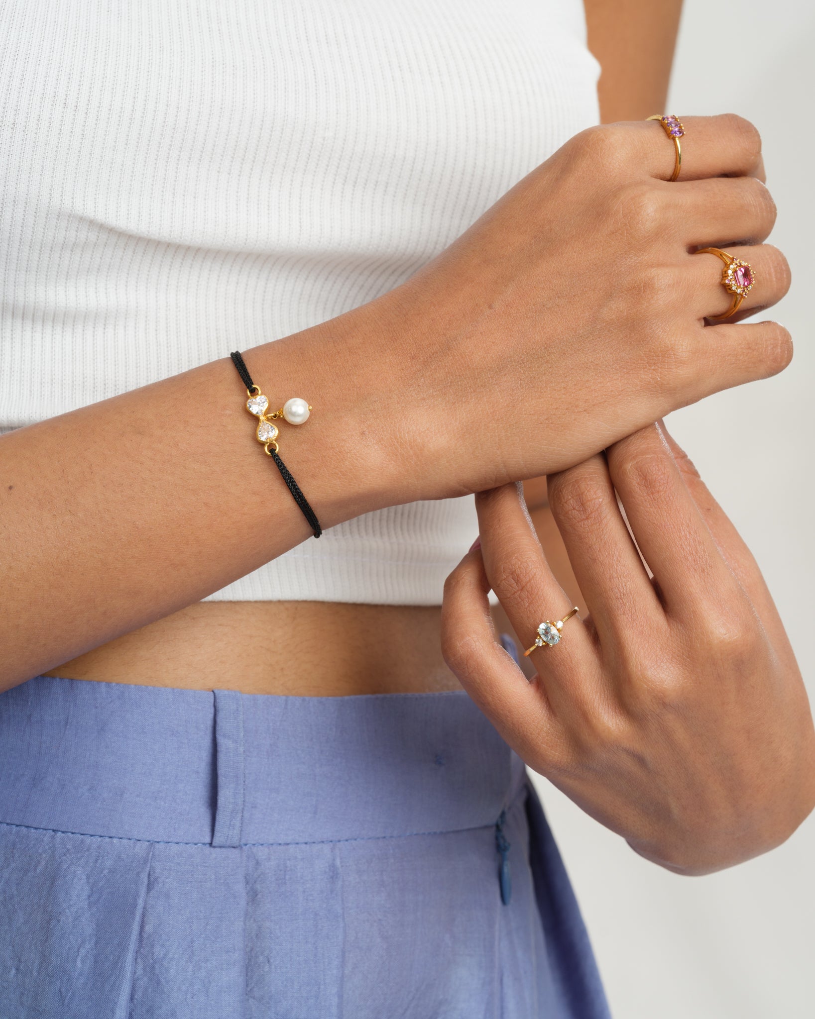 A delicate symbol of protection, reimagined with charm and character. This handmade nazar bracelet features a vintage-style bezel setting that frames a graceful bow made with two heart shaped stones, paired with a dainty dangling pearl. The bow is suspended on an adjustable black thread, designed to comfortably fit every wrist.