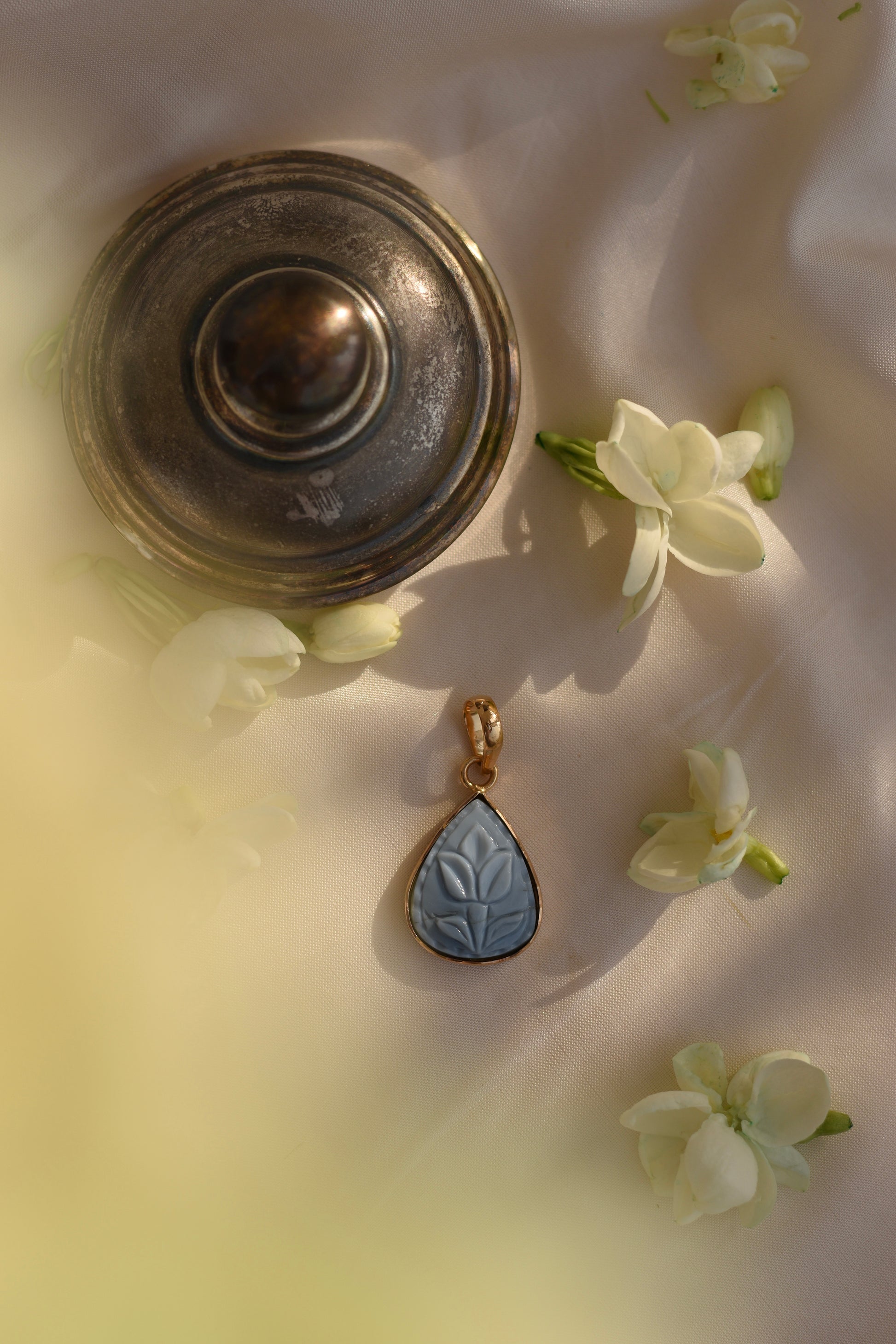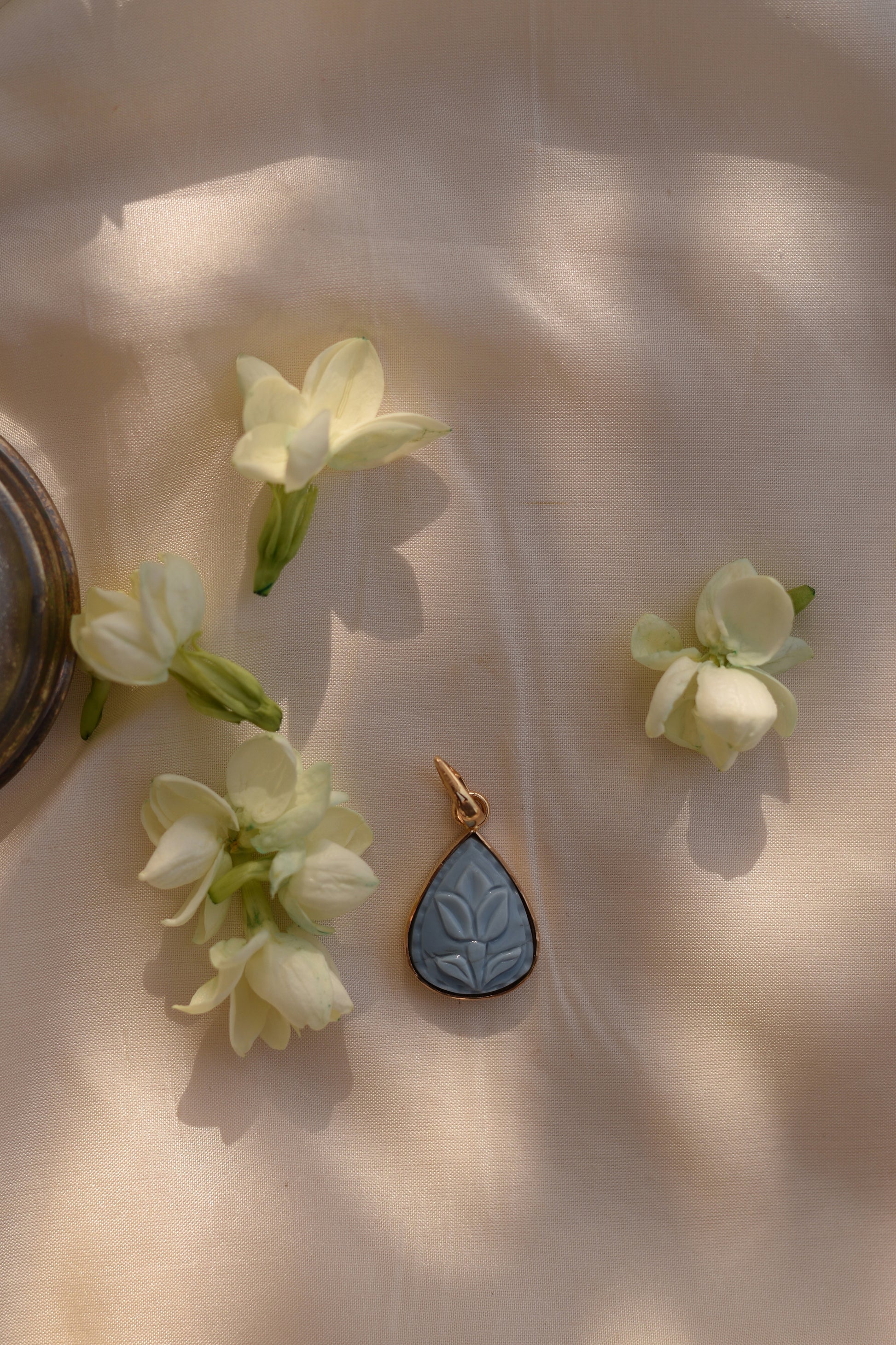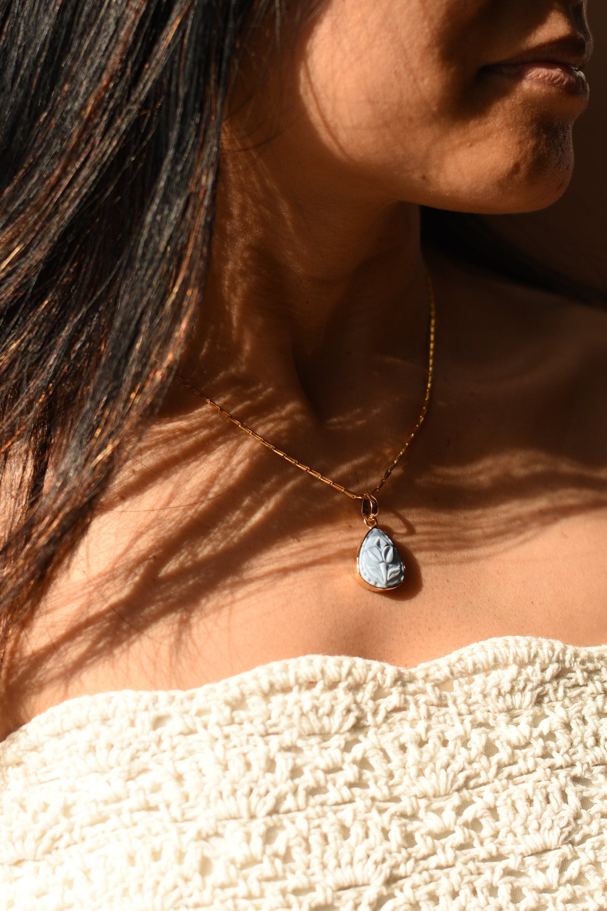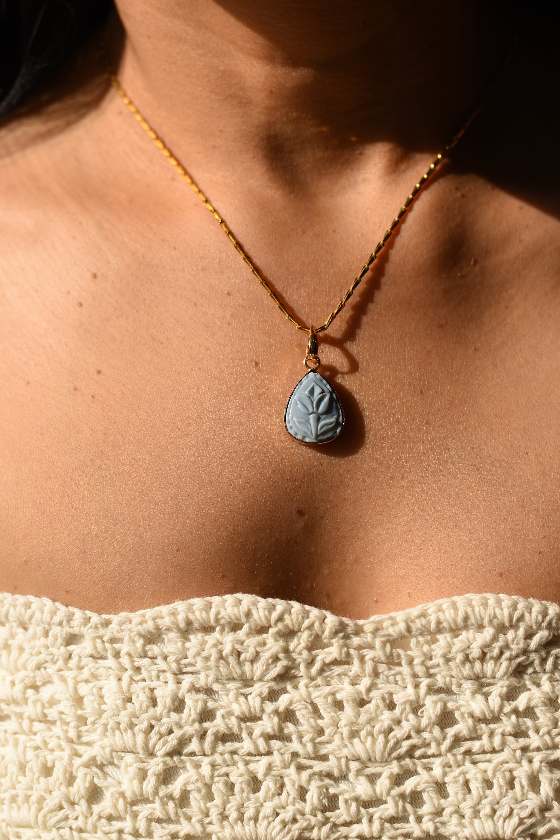 Exquisite craftsmanship is brought to life with the Carved in Blue necklace. Handcrafted in 18 karat gold, it is an old world charm that translates with ease to modernity. This piece is sure to make a statement of luxury and elegance. Every detail is thoughtfully designed to truly elevate your look.