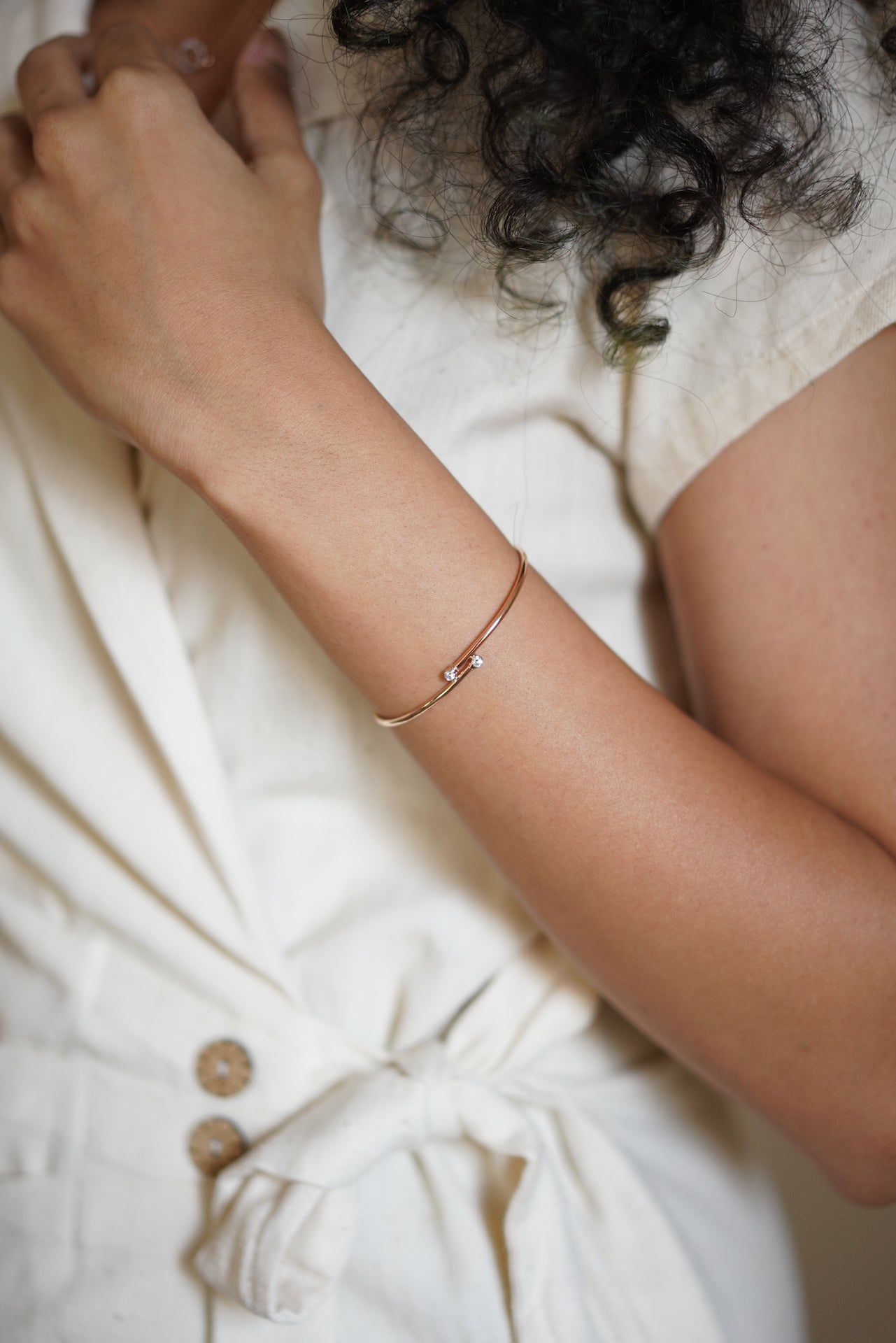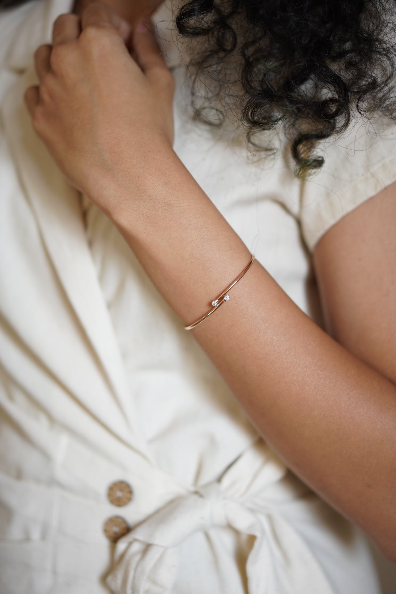 This effortless bangle bracelet is embellished with two single diamonds. Made in 14 karat gold and the best quality (VVS GH) diamonds, it can be effortlessly styled with every outfit you wear. It can also be stacked with your watch.