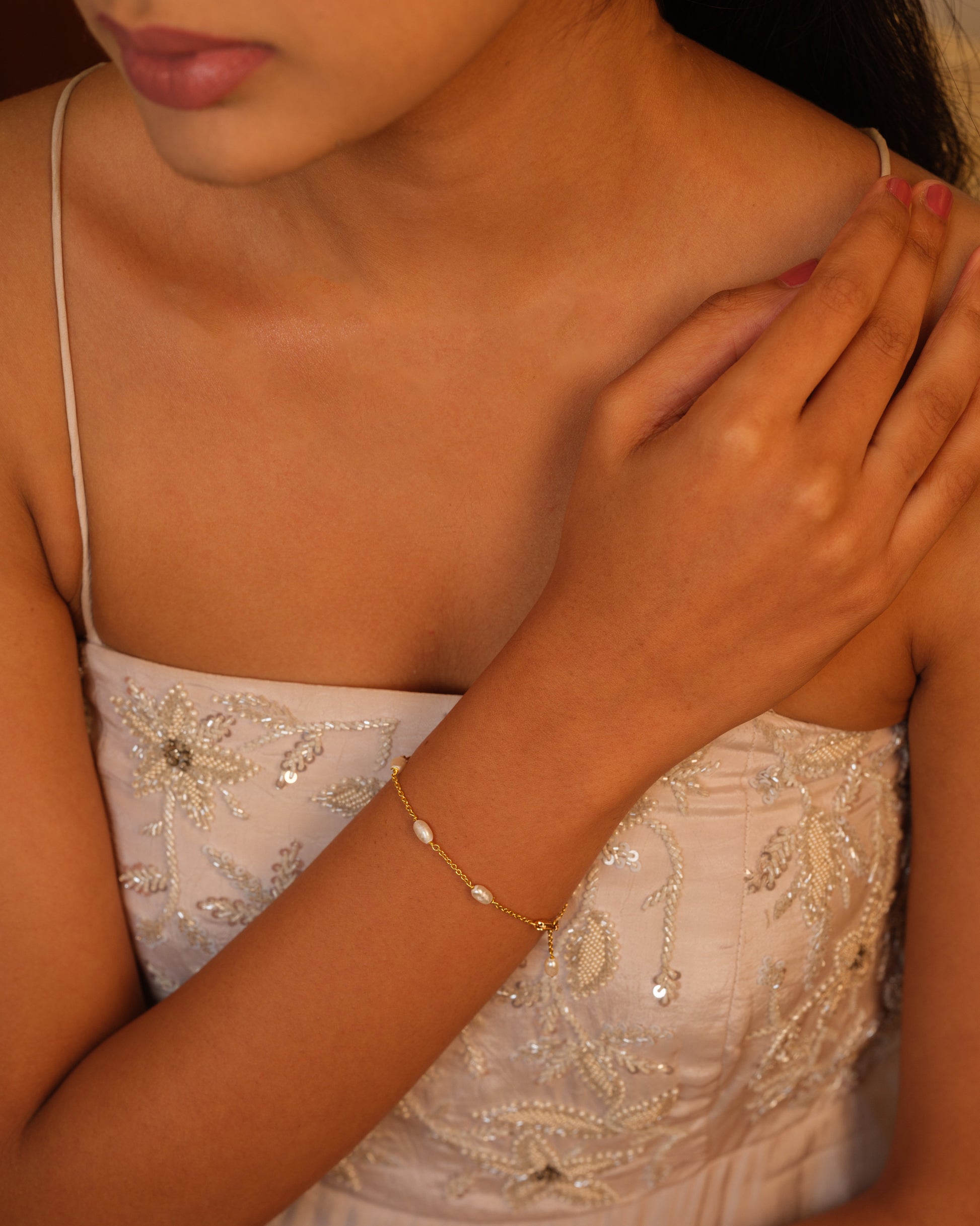 A delicate and sophisticated piece that effortlessly blends classic beauty with modern design. Lustrous pearls, each hand-selected for their radiant sheen, are elegantly strung together on a fine chain, creating a piece that’s both understated and luxurious. The soft, iridescent glow of the pearls adds a touch of refinement to any outfit, making this bracelet perfect for both everyday wear and special occasions.