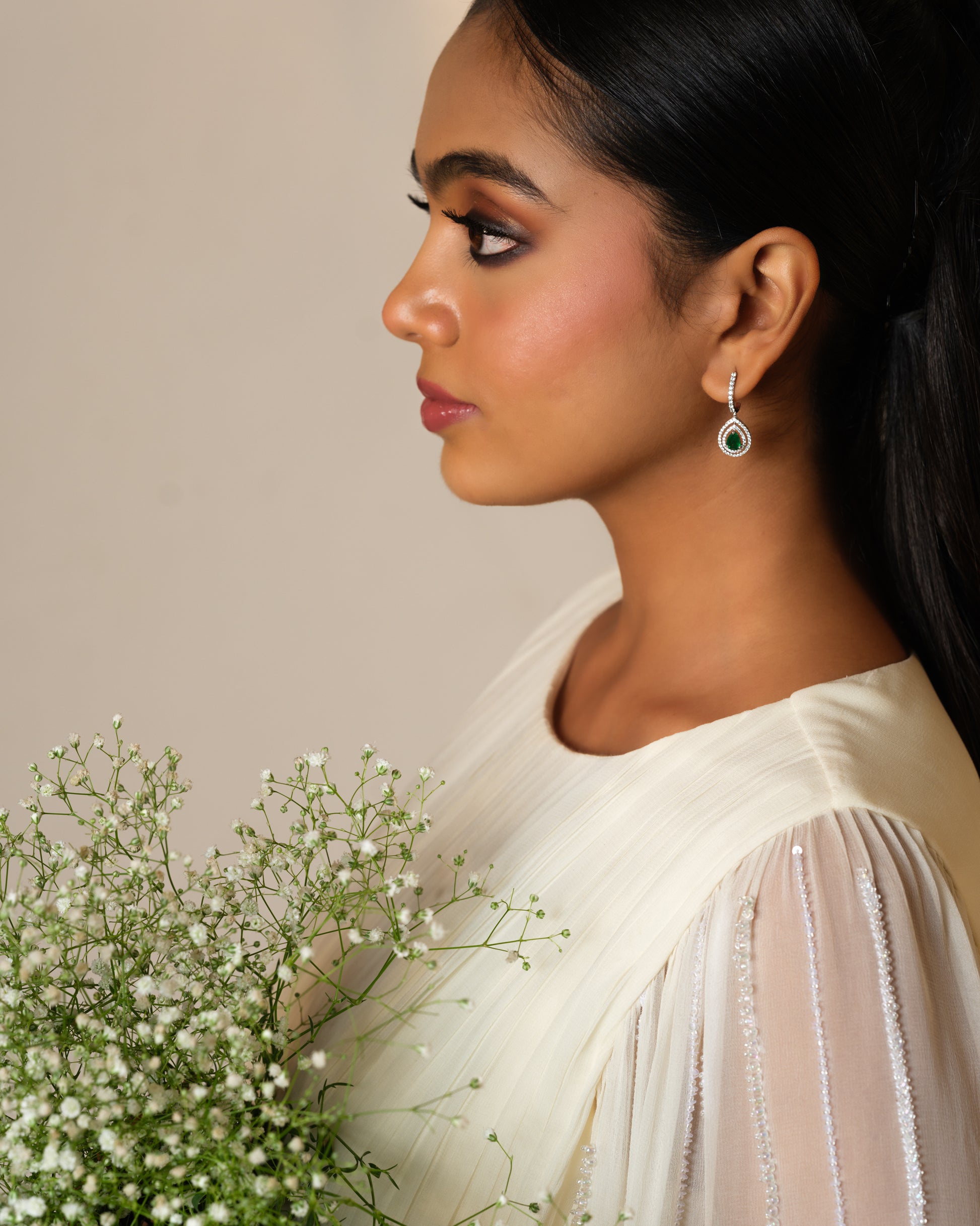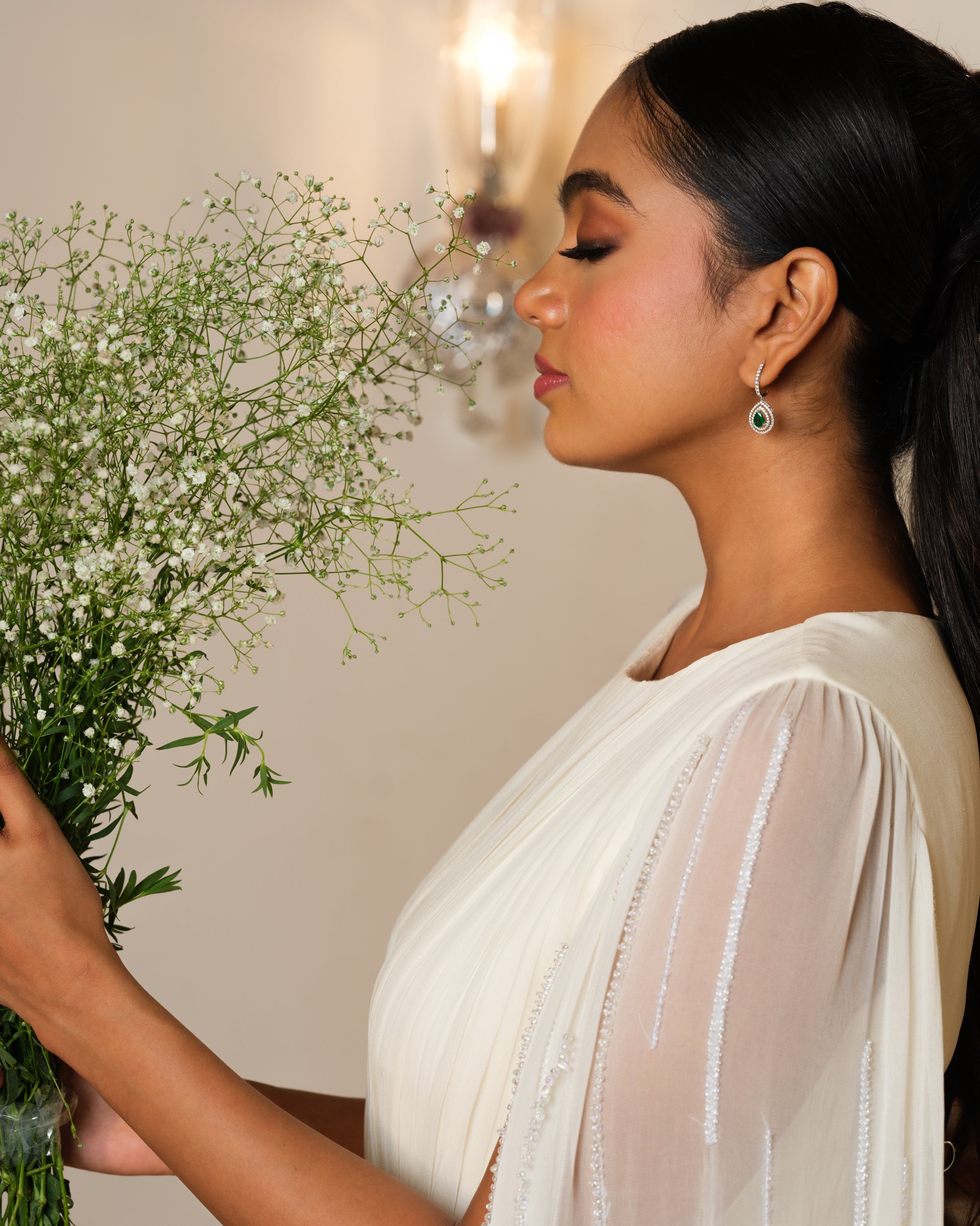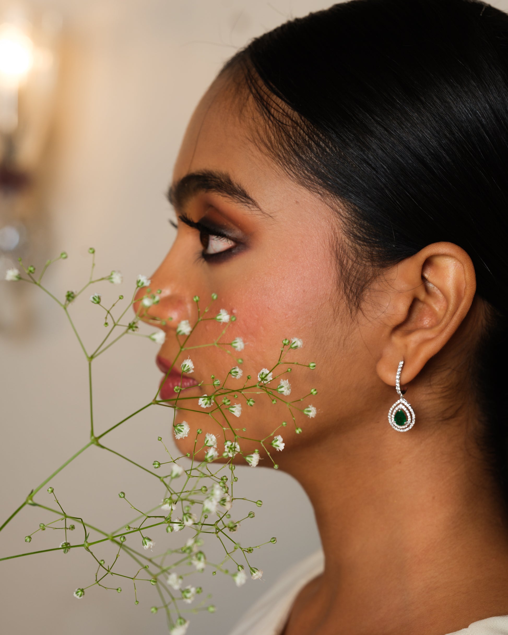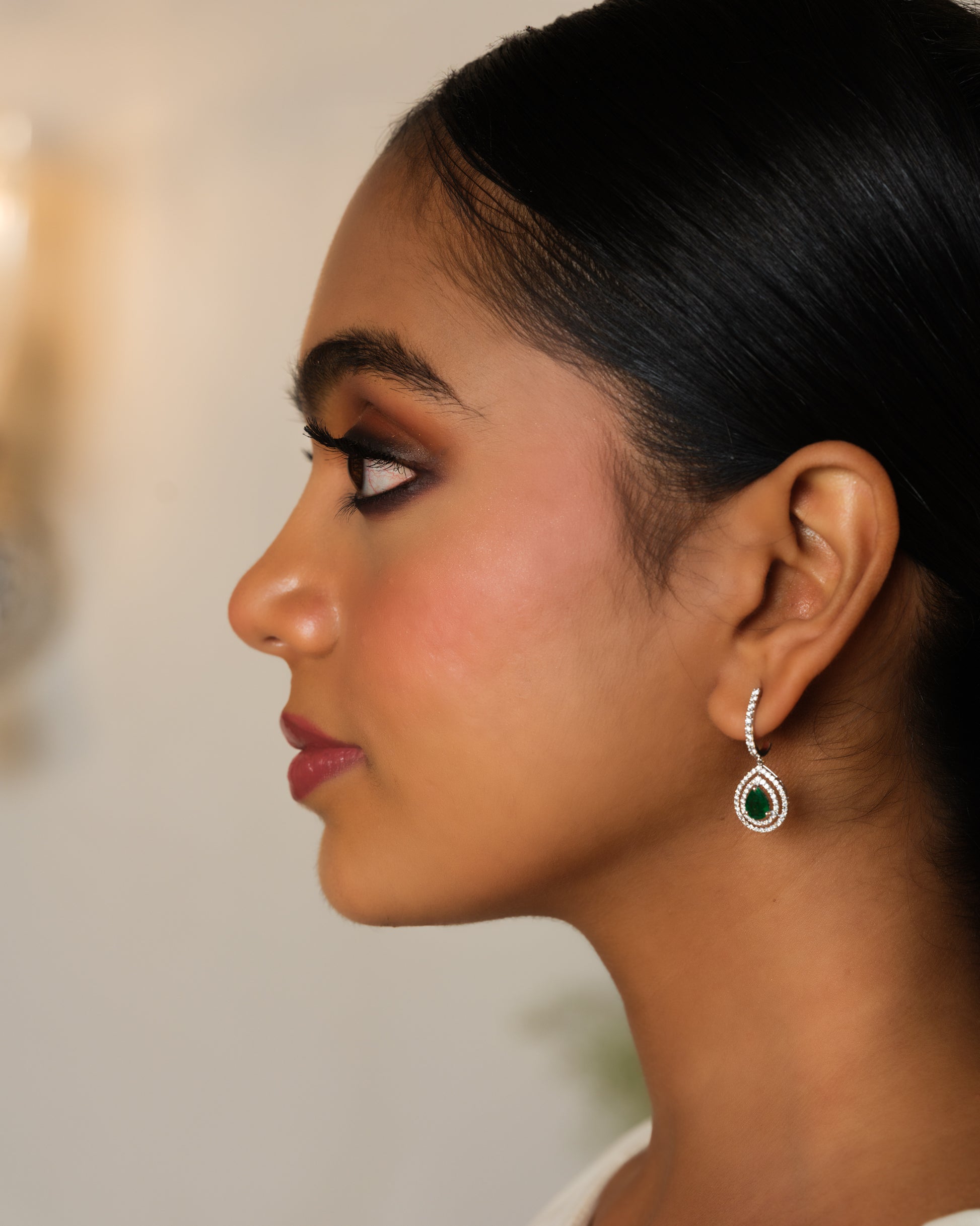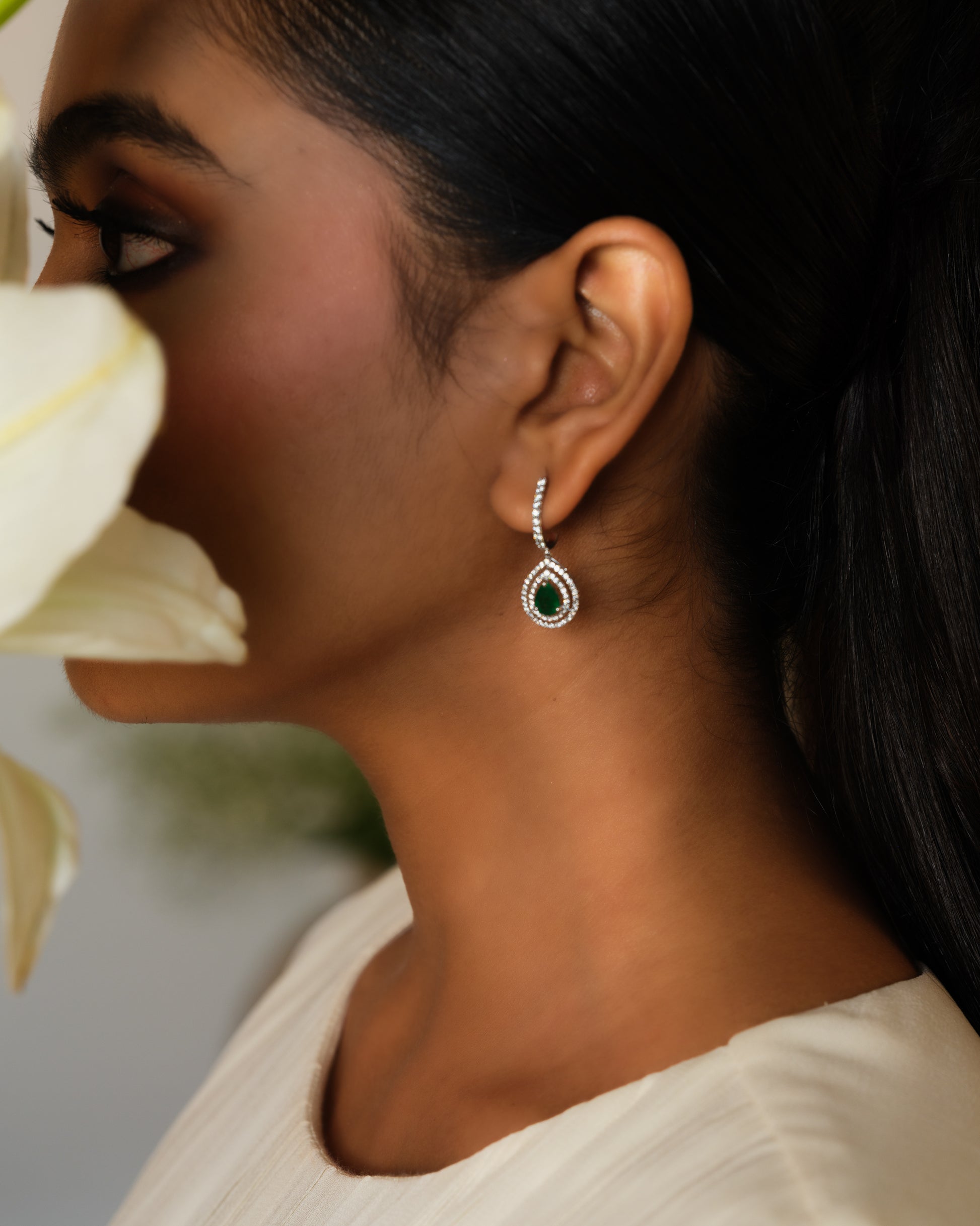 These stunning emerald earrings feature a rich, vibrant Emerald drop, suspended elegantly with a double diamond halo. The diamonds, expertly set to enhance the Emerald's deep green hue, create a captivating contrast, adding sparkle and sophistication. The design exudes timeless elegance, perfect for elevating any outfit with a touch of luxury.
