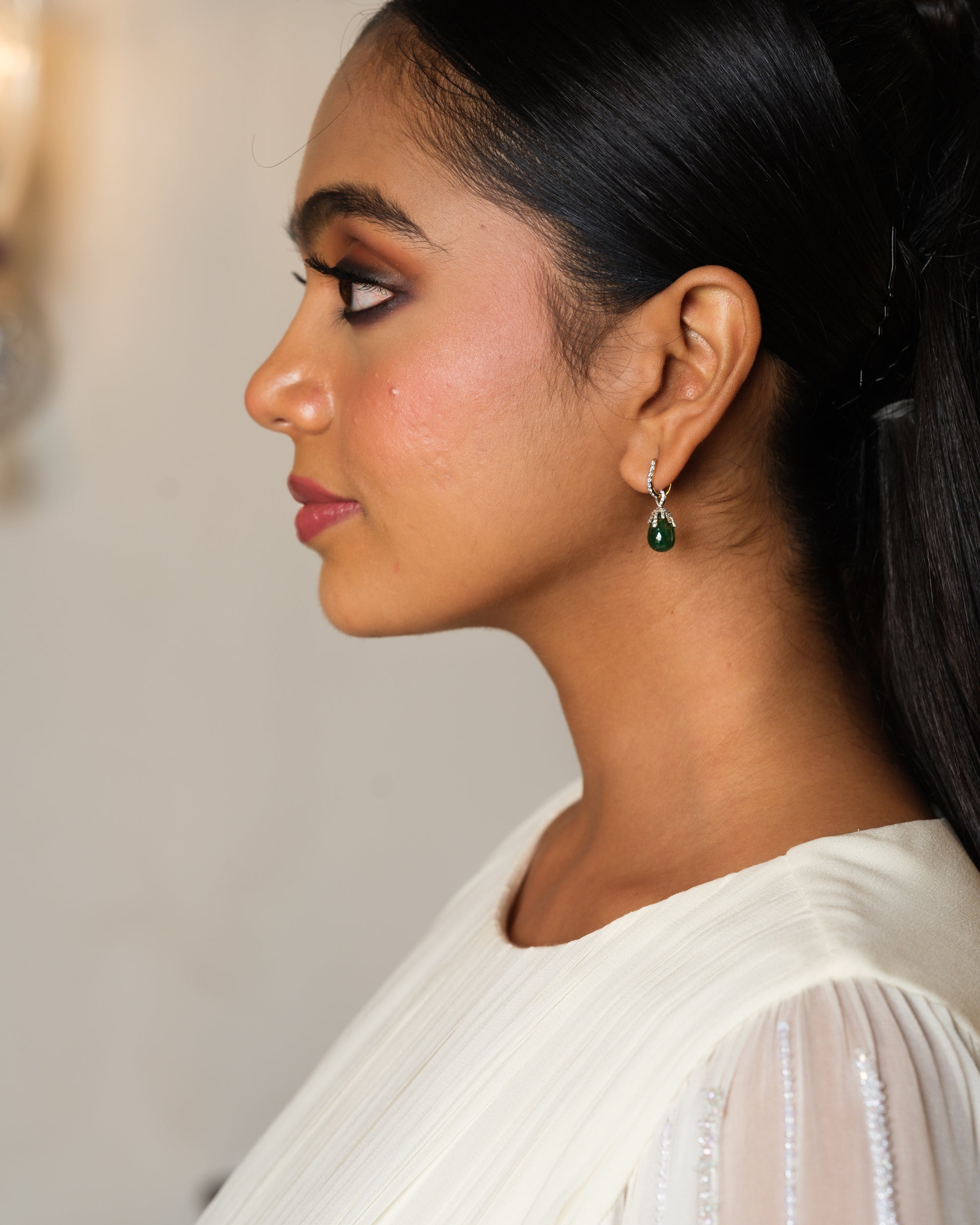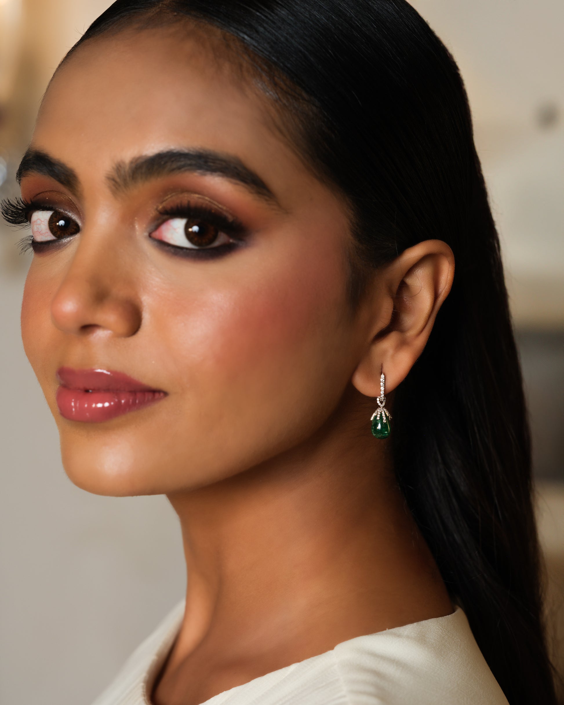 These enchanting Emerald cabochon drop earrings feature rich green stones, beautifully cradled by diamond-encrusted lines that evoke the delicate twist of ivy. The diamonds wrap around the Emeralds like protective vines, symbolising nature’s embrace. The design blends sophistication with organic beauty, making these earrings a timeless and captivating statement piece.