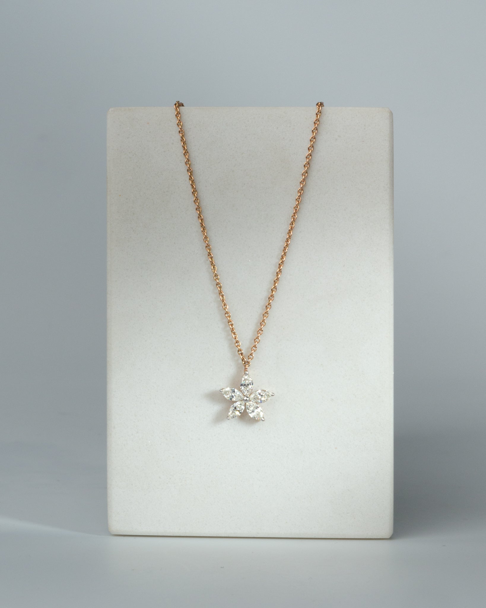 A twist on the classic five petal flower pendant. It is made with the best marquise diamonds (VVS GH), set beautifully in 14 karat solid gold. IGI certified.