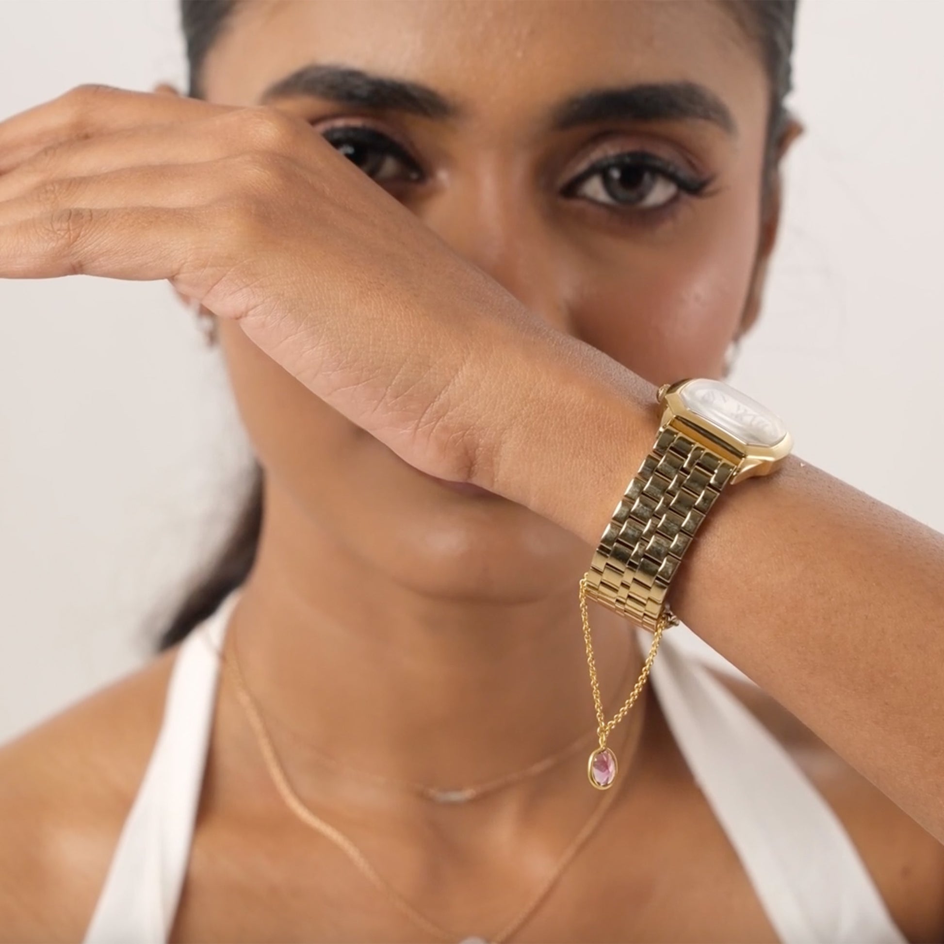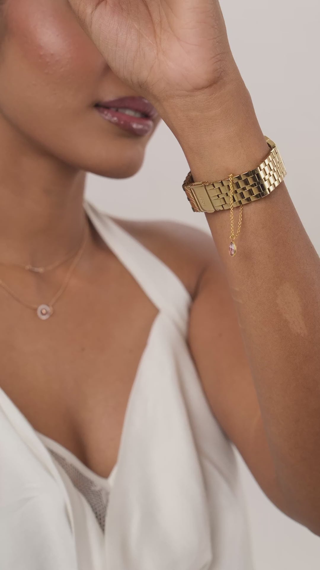 Tourmaline watch charm features a luminous oval-cut natural Tourmaline, bezel-set and suspended from a slender gold chain. A fluid, playful detail that moves with your every move.