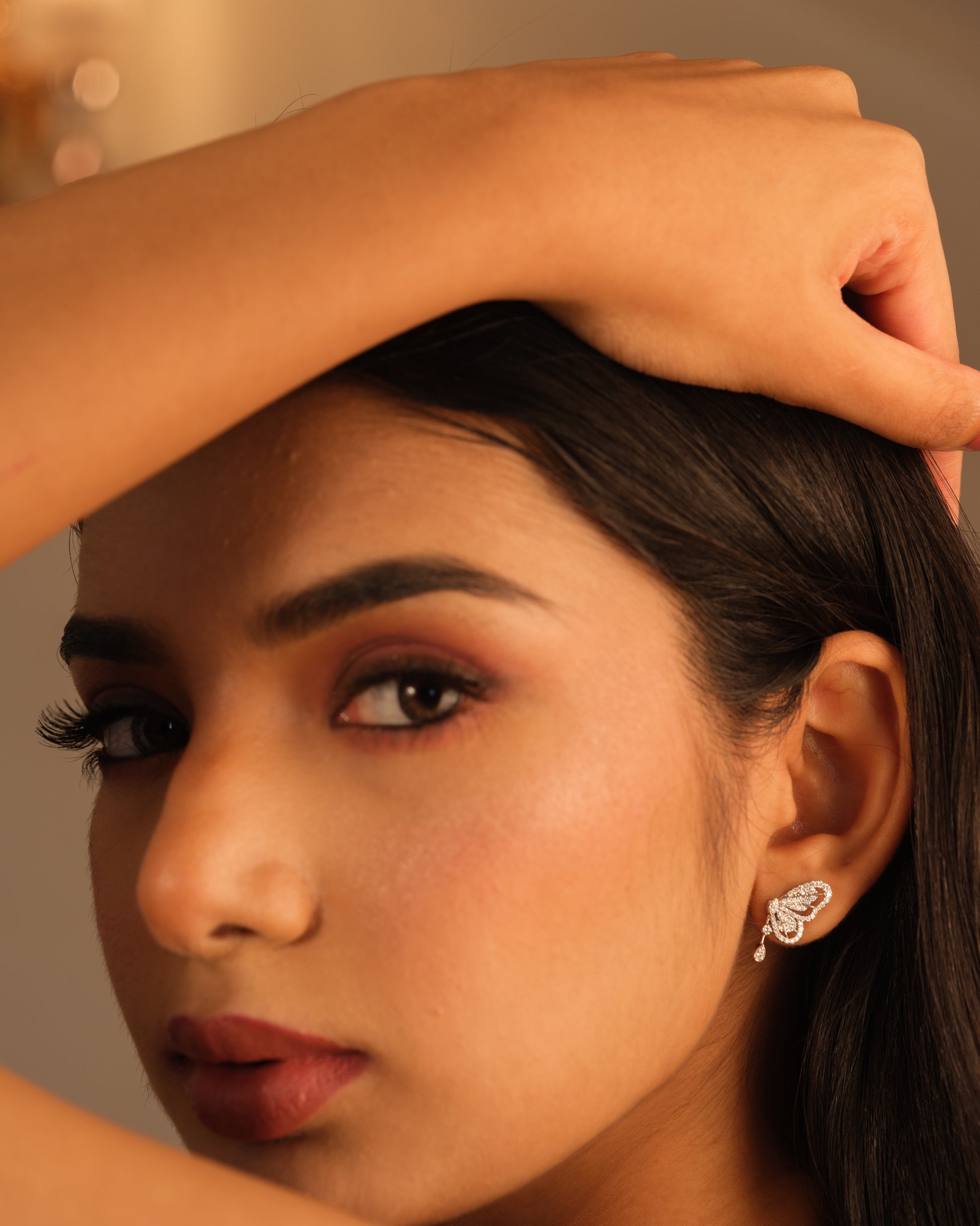 These Art Nouveau-inspired butterfly earrings feature delicate diamond-studded wings, capturing the elegance of nature. The intricate design, with shimmering diamonds set in flowing curves, reflects the organic beauty of the period. Crafted in fine metalwork in 18 karat gold, they offer a timeless, whimsical touch of luxury and grace.