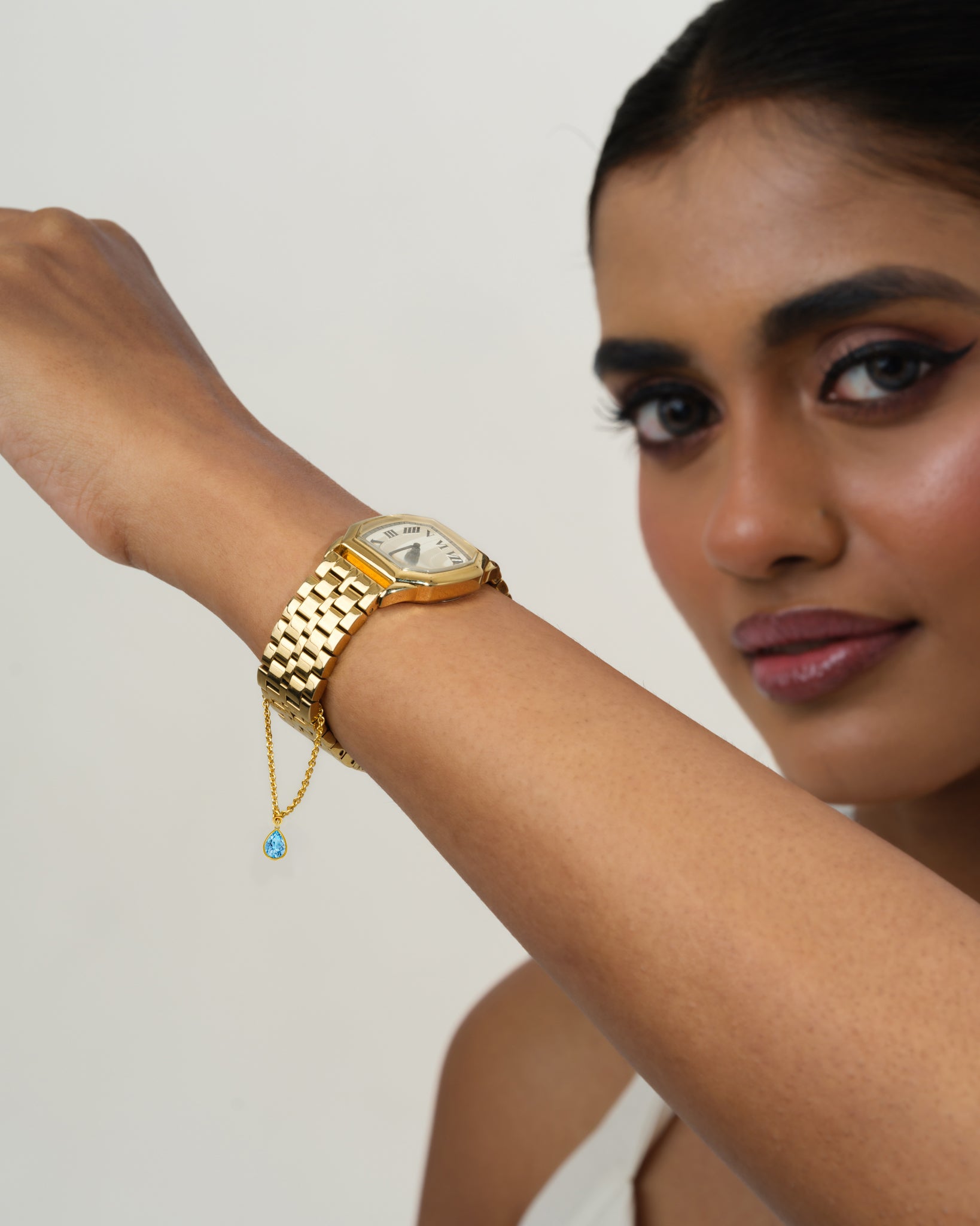Aquamarine watch charm features a luminous pear shaped natural Aquamarine, bezel-set and suspended from a slender gold chain. A fluid, playful detail that moves with your every move.