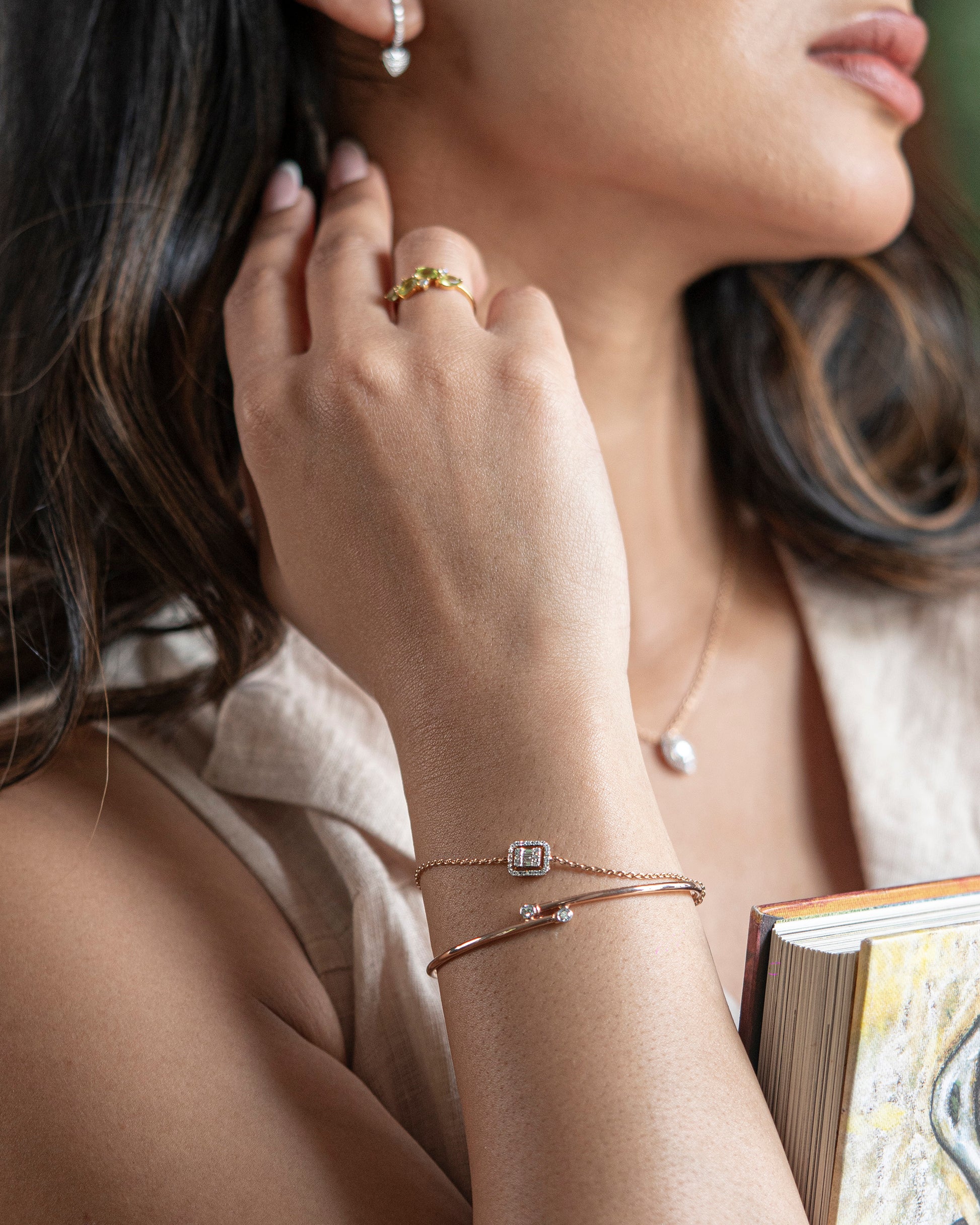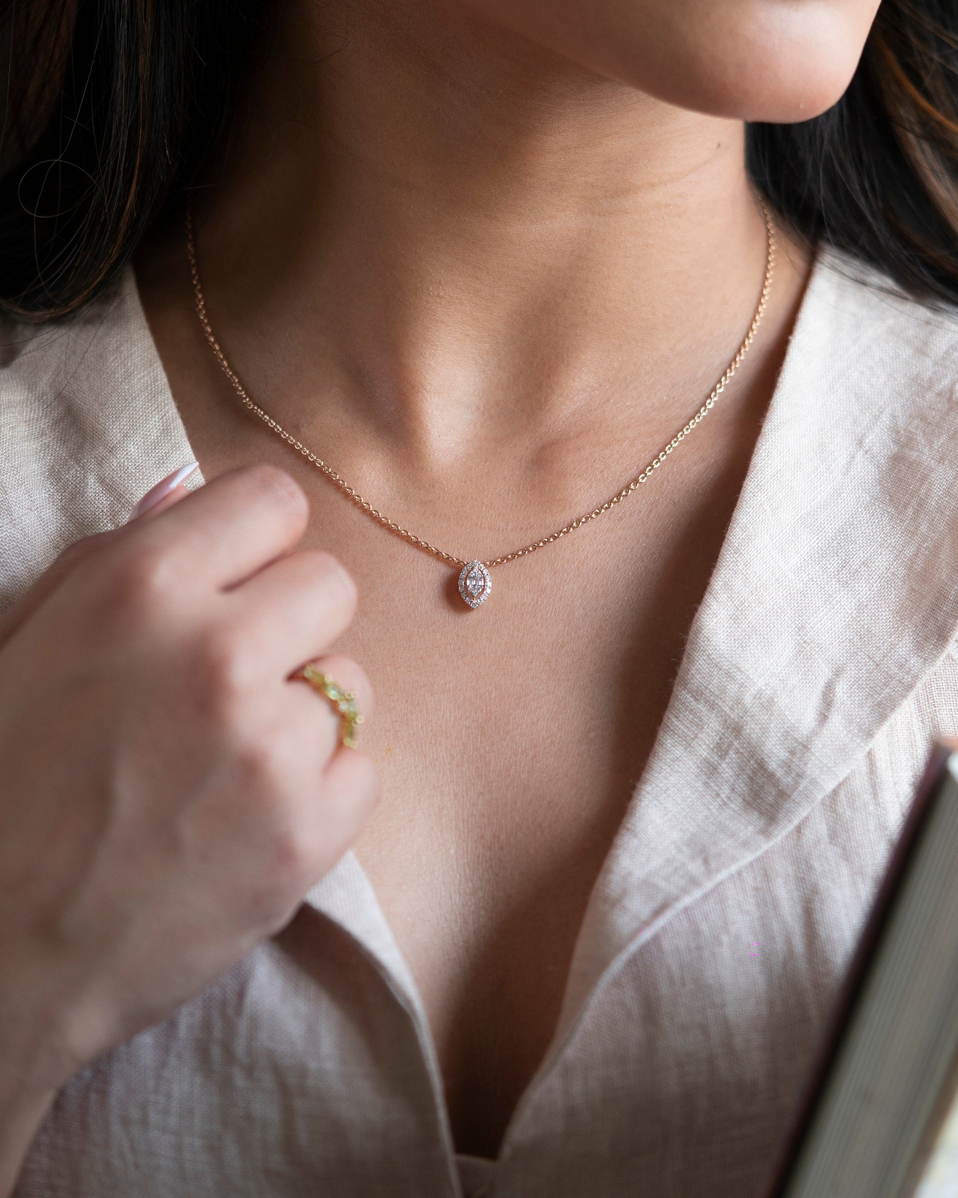 Smaller diamonds studded together to appear like one big marquise diamond from a distance. This necklace is made in 18 karat solid gold using the best quality natural diamonds. Perfect add for your daily stack.