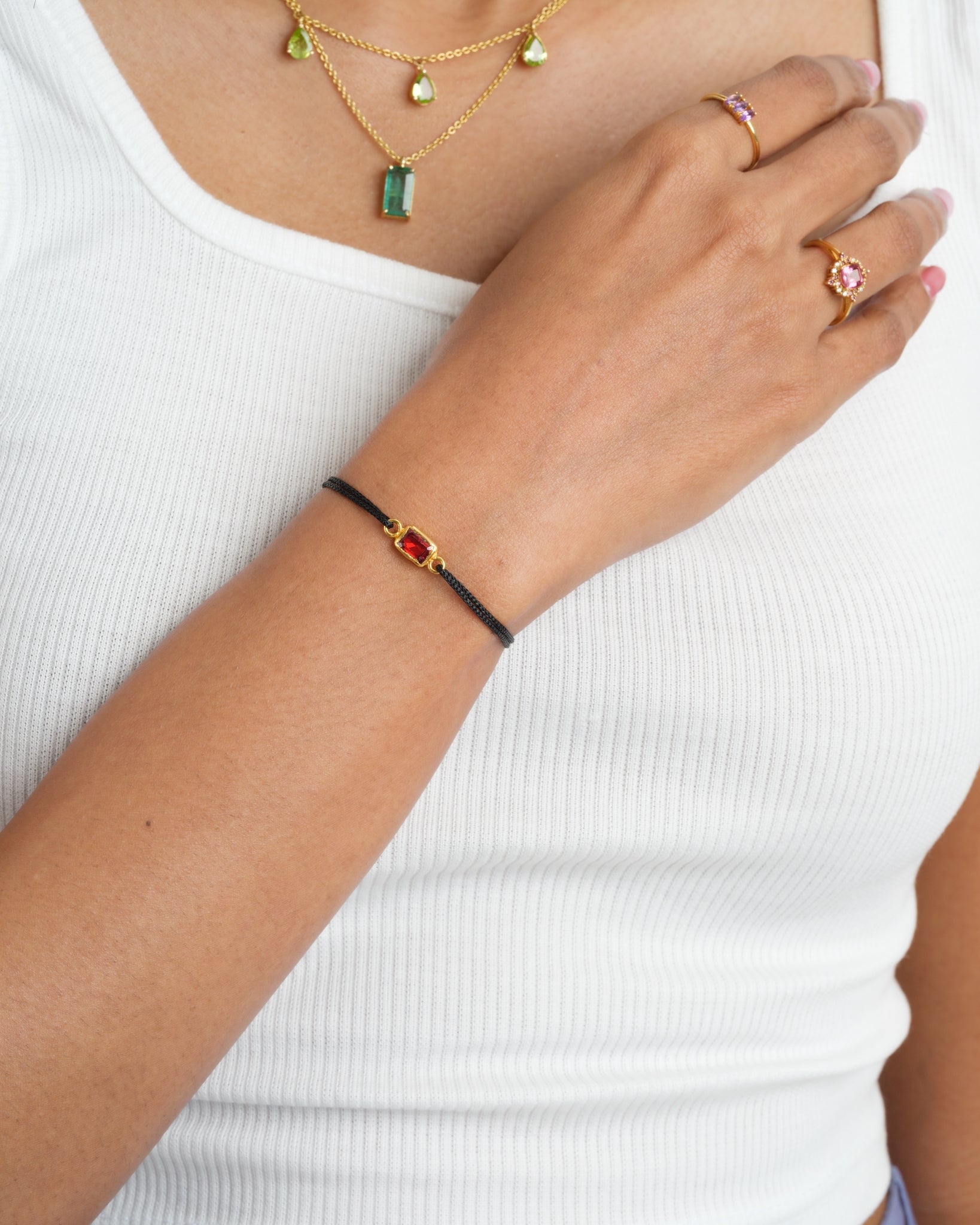Handmade nazar bracelet featuring a deep red stone. Set in a vintage style bezel, the centrepiece is suspended with a black cord that is adjustable and fits everyone.