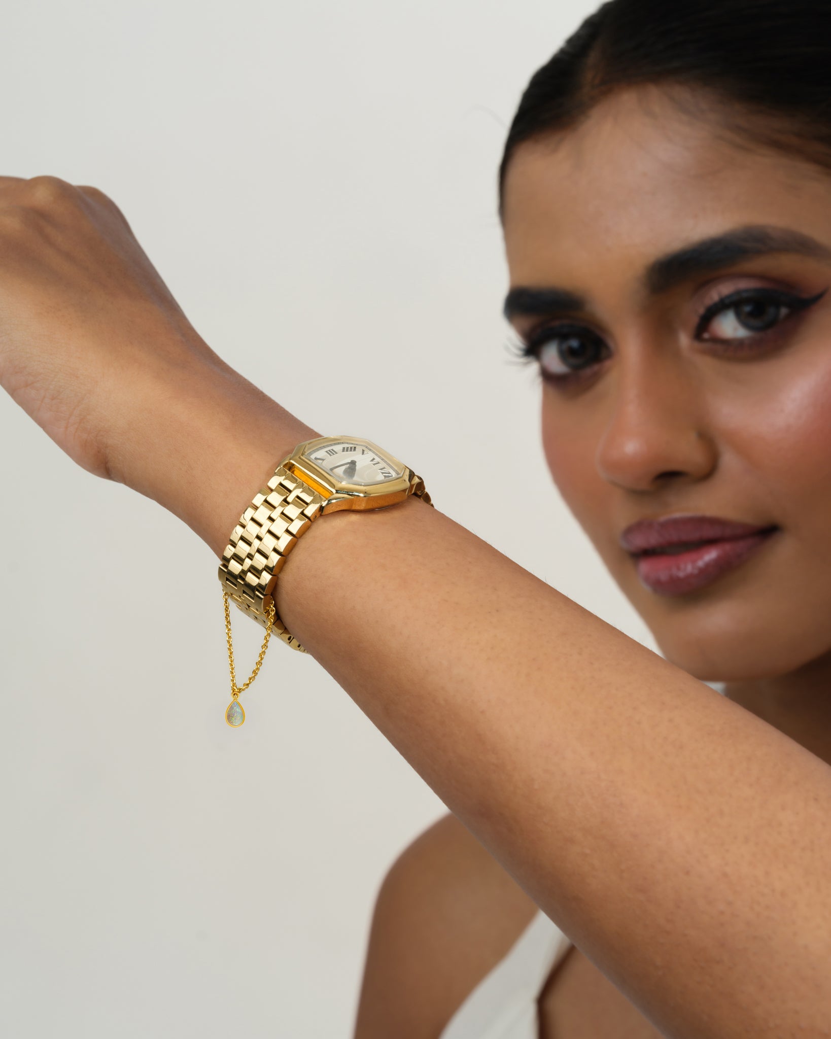 Opal watch charm features a natural round shaped Opal, bezel-set and suspended from a slender gold chain. A fluid, playful detail that moves with your every move.