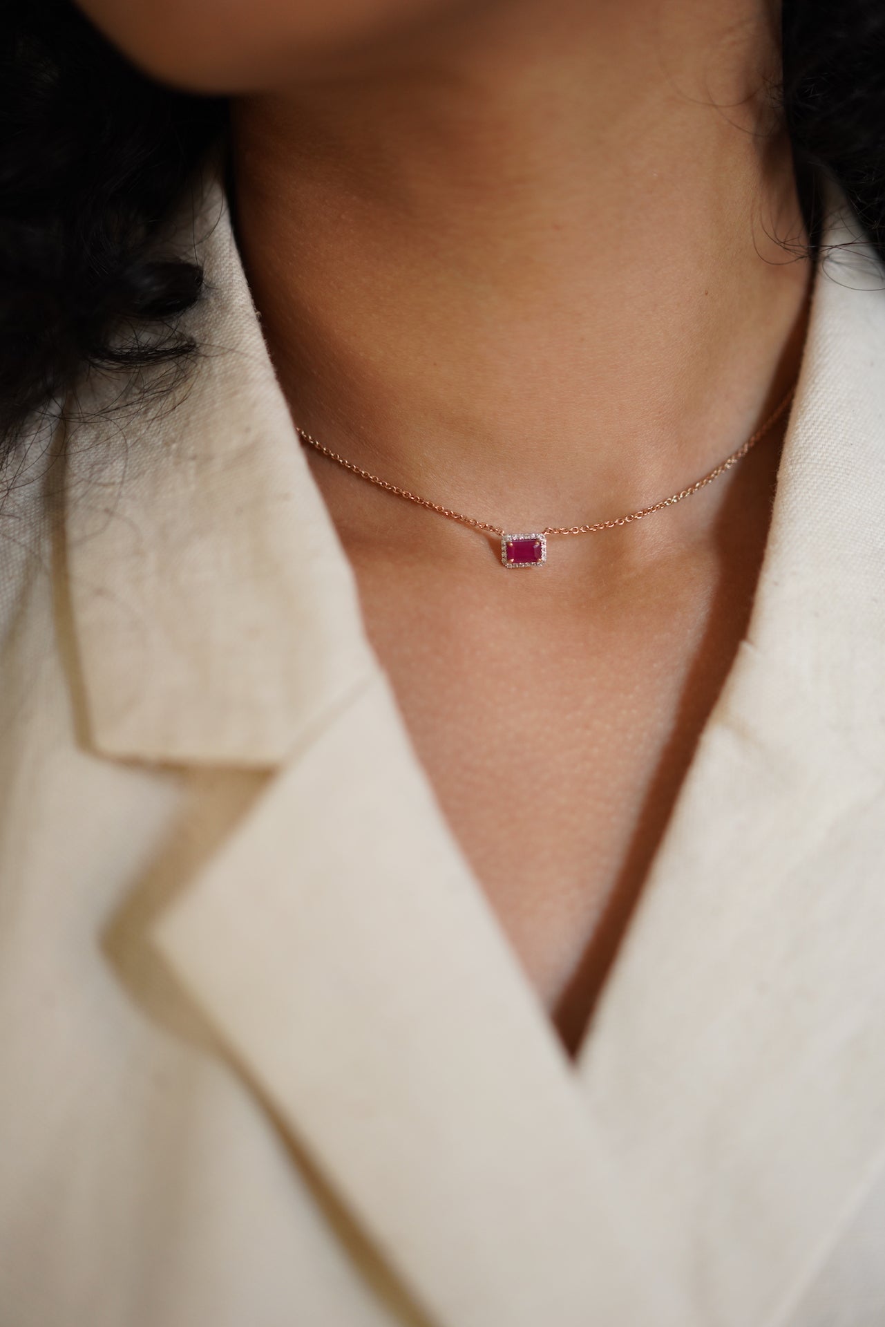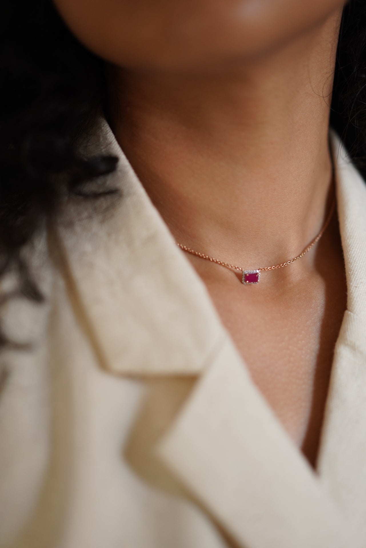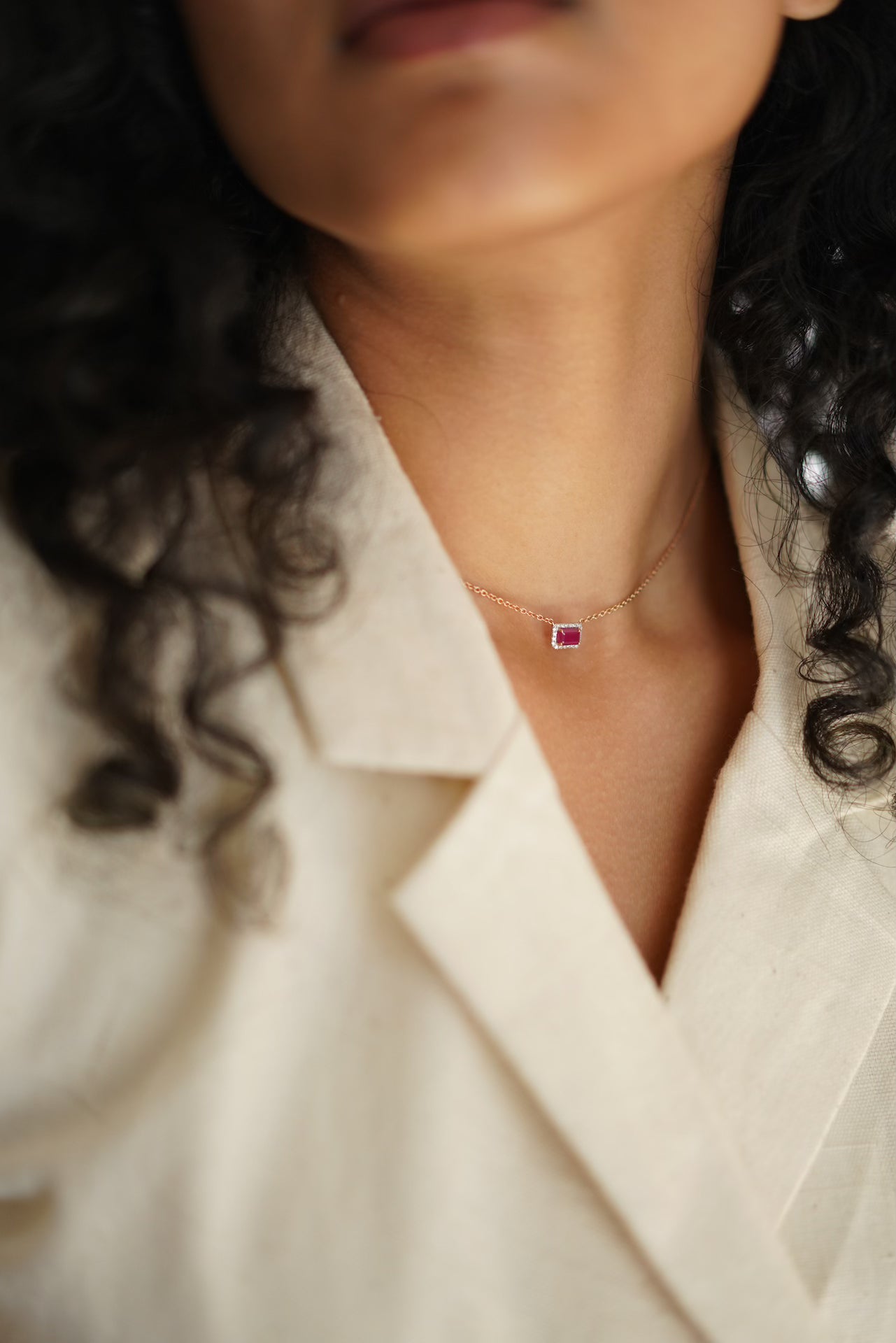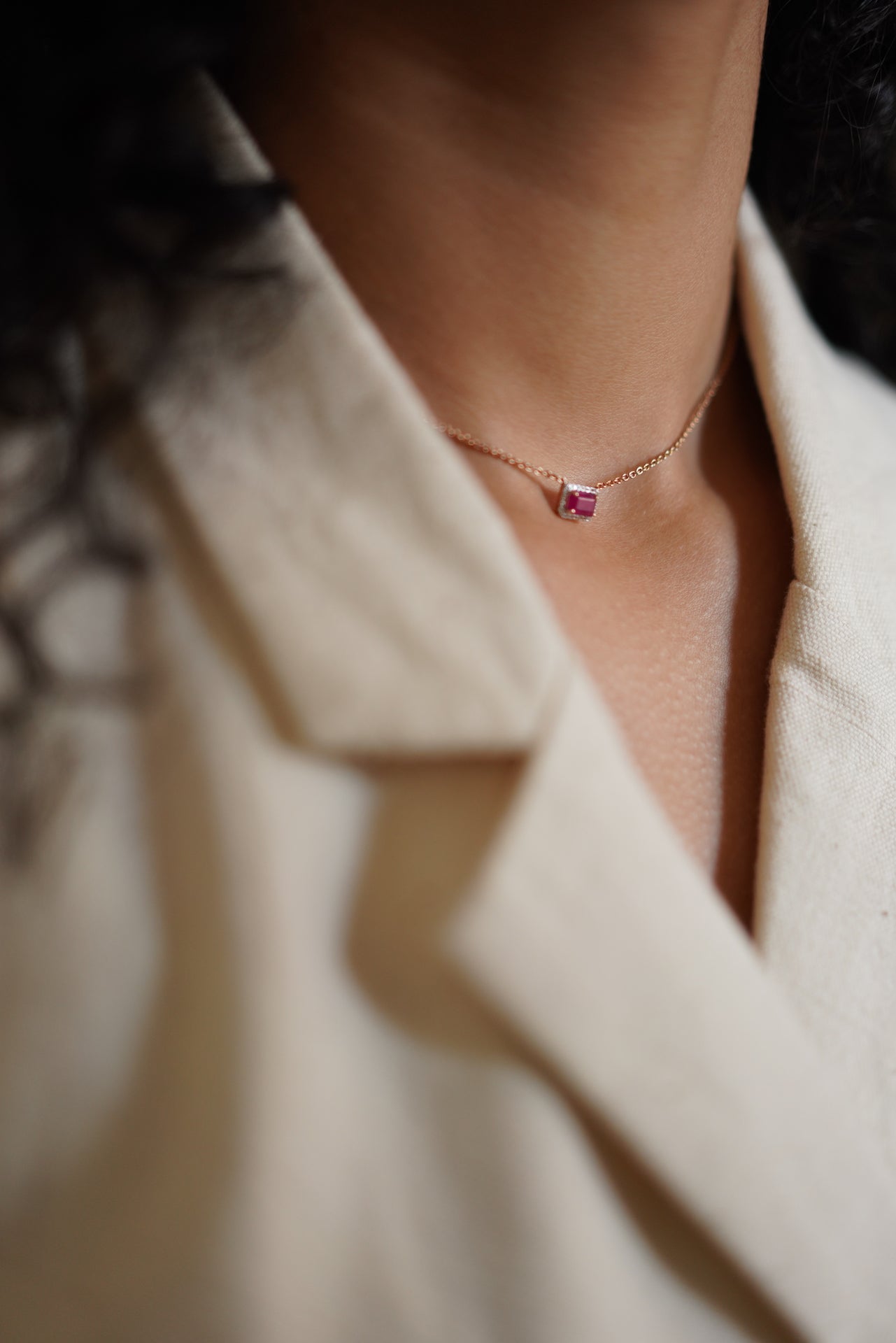 Ruby with diamonds, probably the most romantic combination of gemstones. This necklace is meant for soirées under moonlit skies when the air is filled with warmth and love. It sits perfectly on you, almost like second skin, reflecting light and warmth as the moonlight touches your neck.