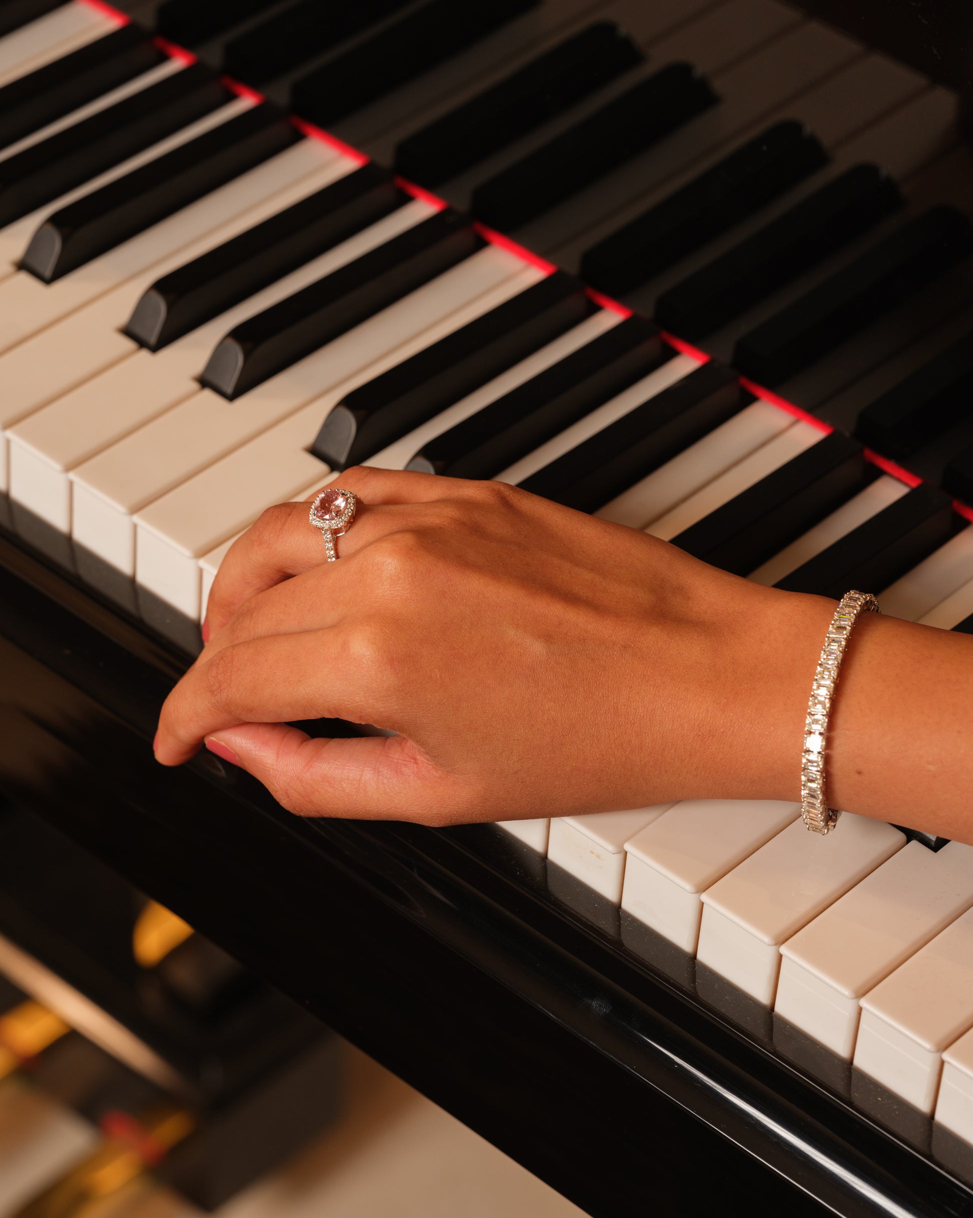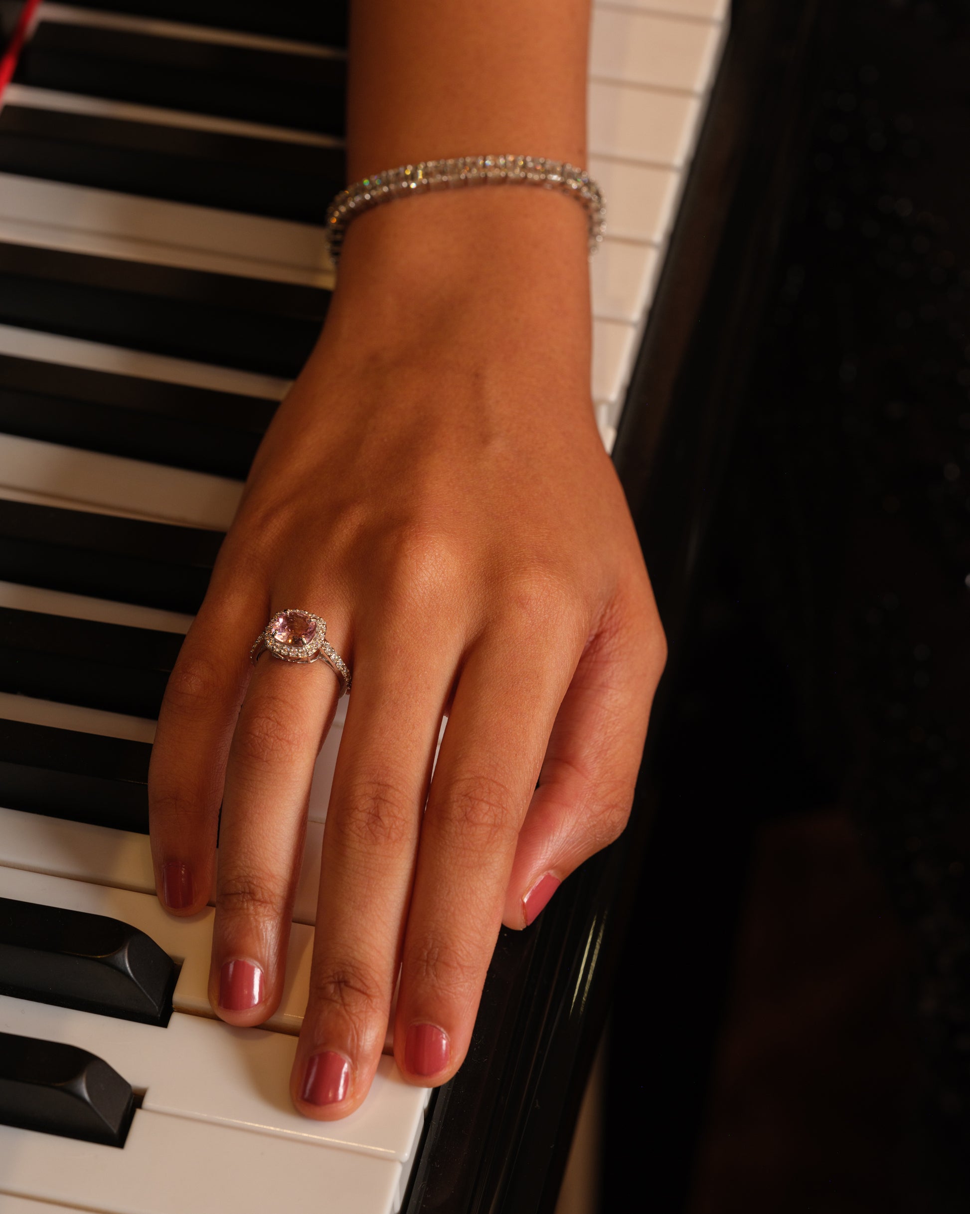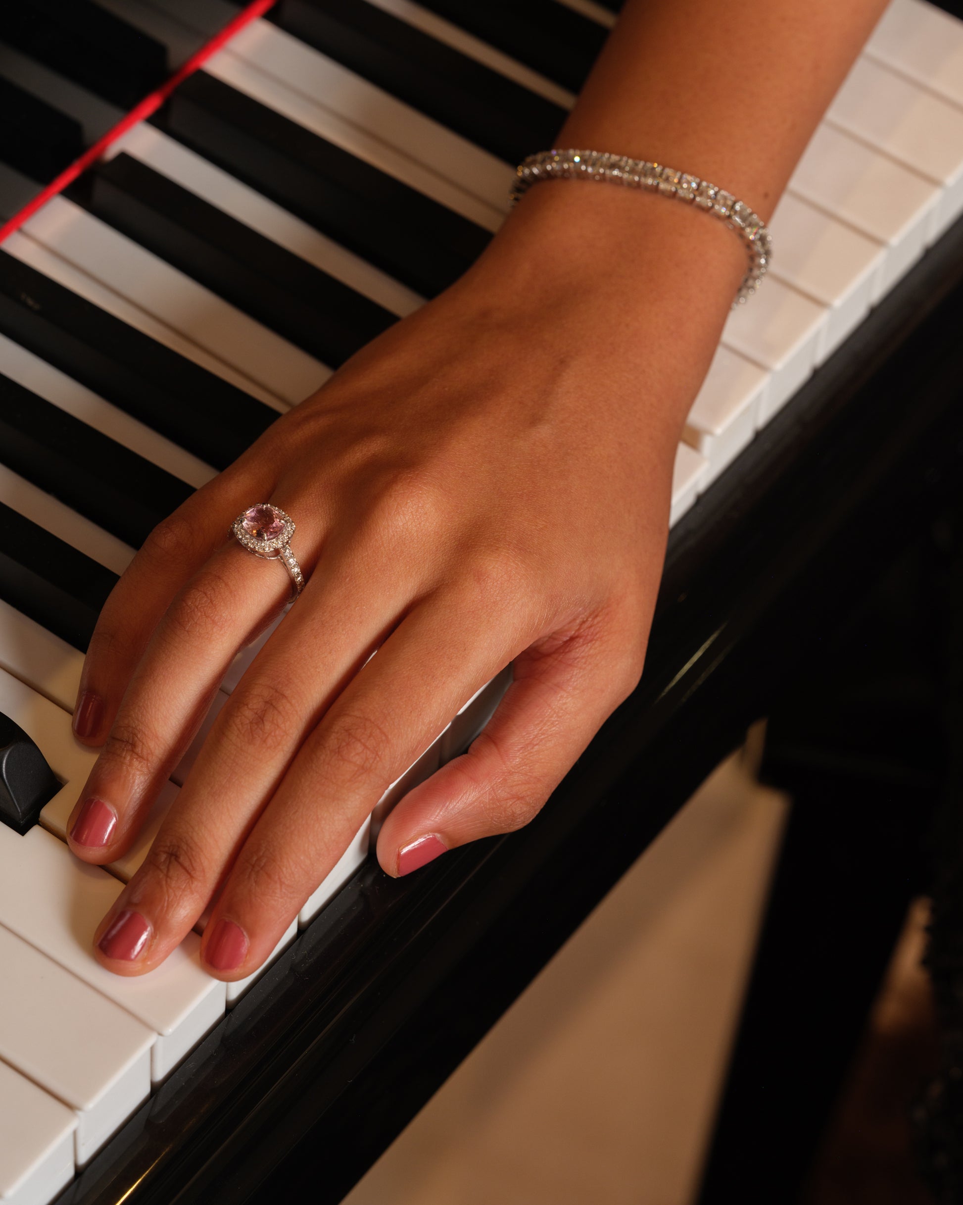 This exquisite cushion-shaped pink tourmaline ring is inspired by the Art Nouveau period, where nature’s beauty was celebrated in every detail. The soft, rosy pink of the tourmaline evokes the delicate petals of a blooming flower, symbolising love, renewal, and harmony. Surrounded by a halo of sparkling diamonds, the stone is framed like a blossom in full bloom. This ring beautifully captures the essence of nature’s timeless elegance, blending romanticism with the brilliance of diamonds.