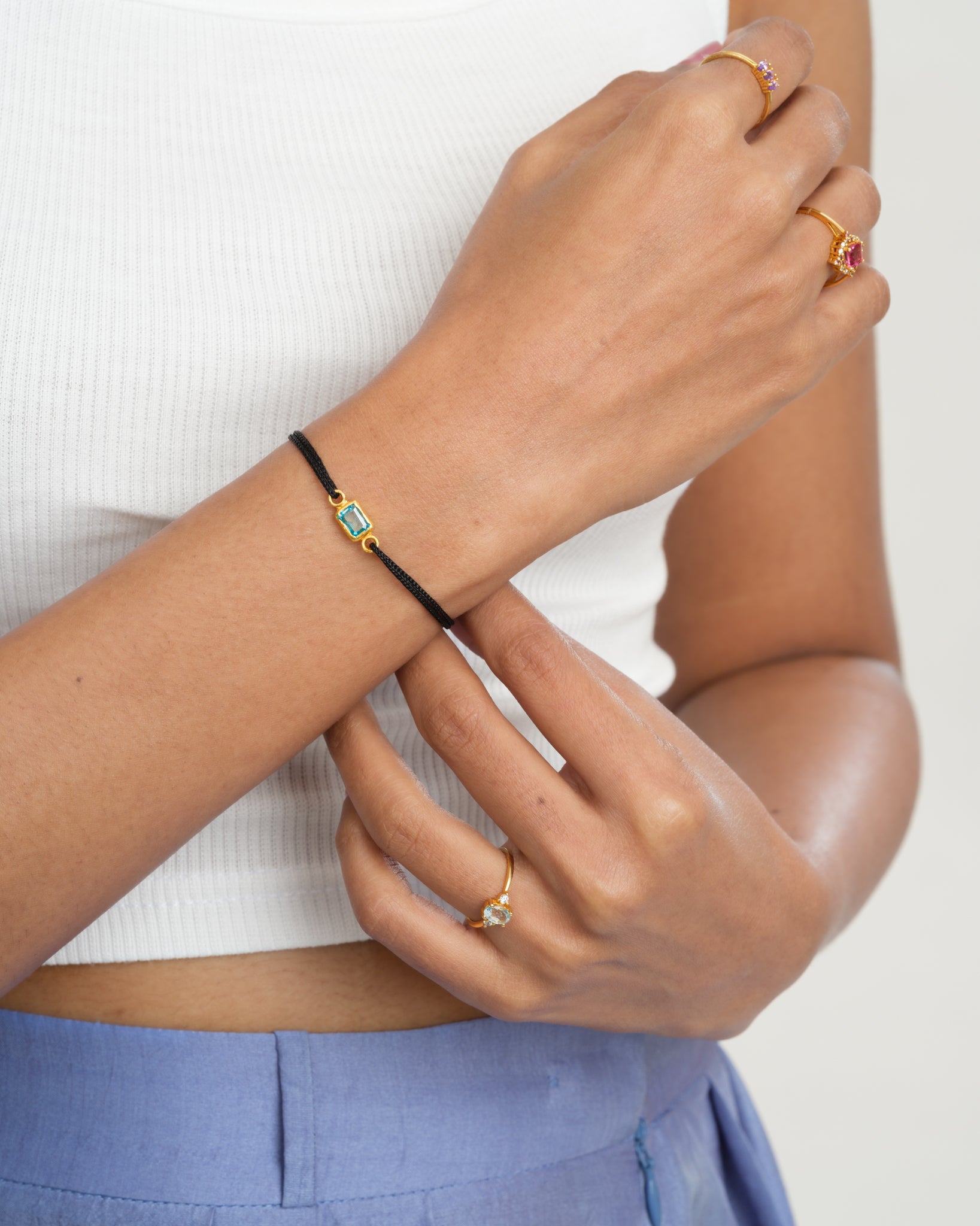 Handmade nazar bracelet featuring a sky blue coloured stone. Set in a vintage style bezel, the centrepiece is suspended with a black thread that is adjustable and fits everyone.