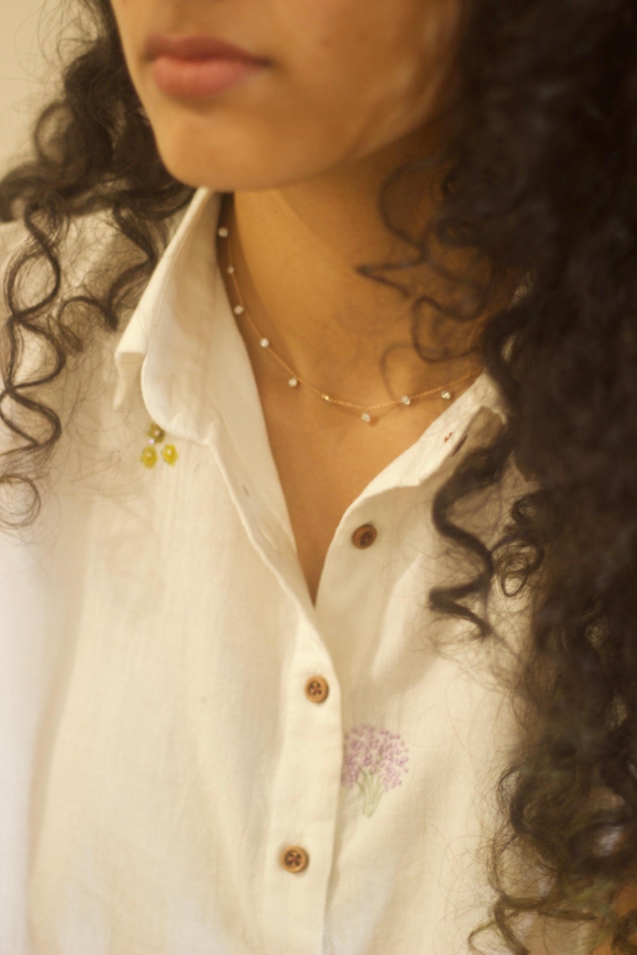 This necklace is our personal favourite. It's like all the stars from the sky were brought down to the Earth to sit beautifully on your neck. The diamonds sway and dangle in tune with your movement and yet are very comfortably lying on your neck, strung on a fine gold chain. Made with VVS GH diamonds, 14 karat gold and is IGI certified.