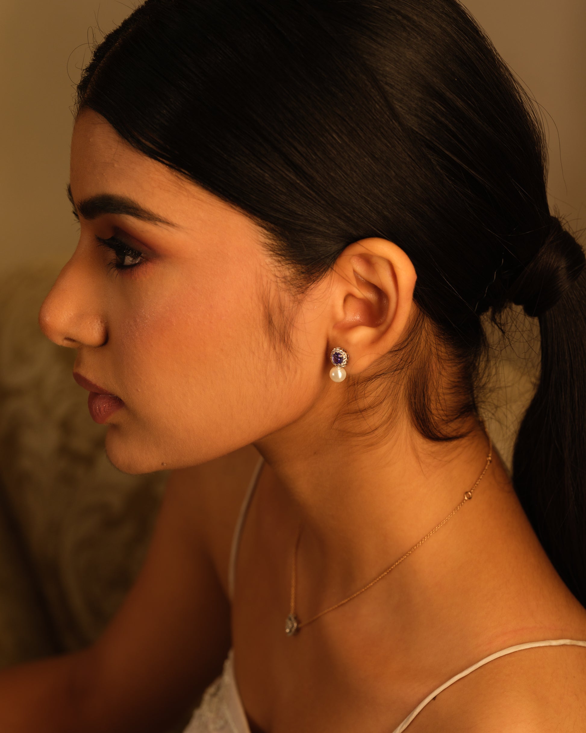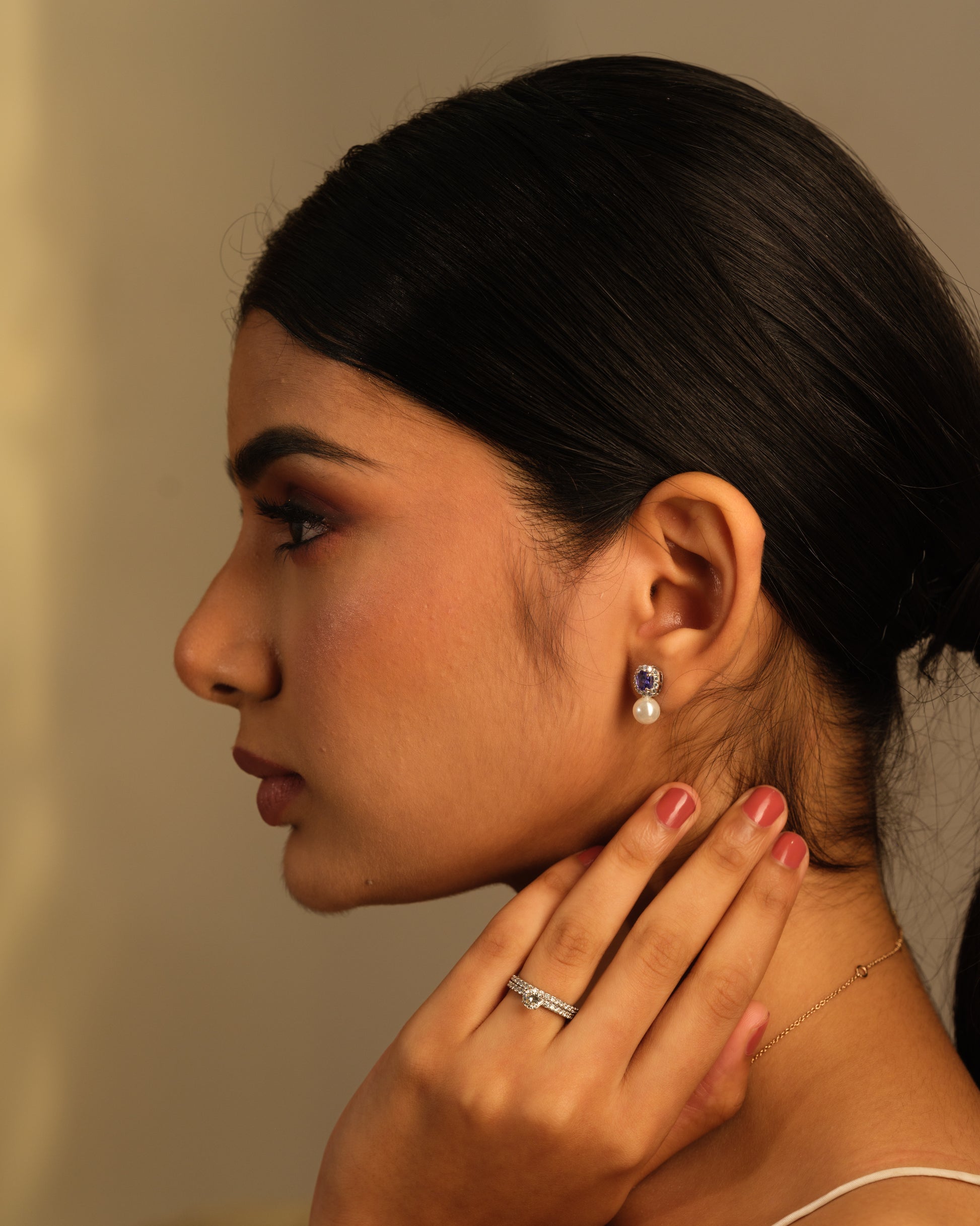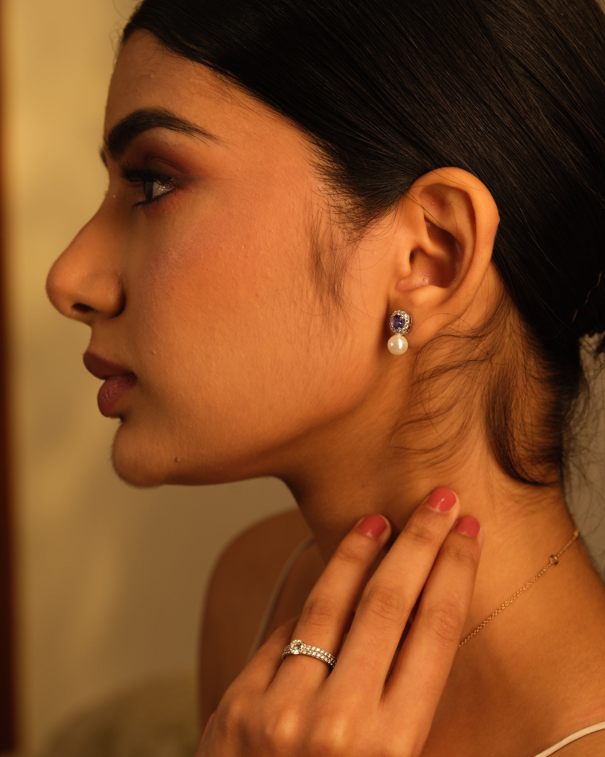 These Art Nouveau-inspired earrings feature the most graceful- Tanzanite stones framed by a delicate diamond halo, exuding timeless elegance. A graceful pearl drop dangles below, enhancing the flowing, organic design. The intricate craftsmanship and harmonious mix of gemstones evoke the beauty of nature, creating a piece that’s both refined and luxurious.