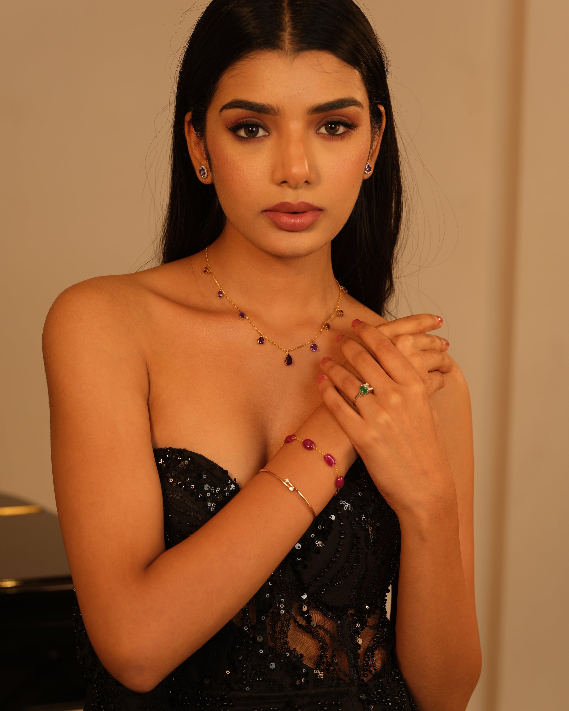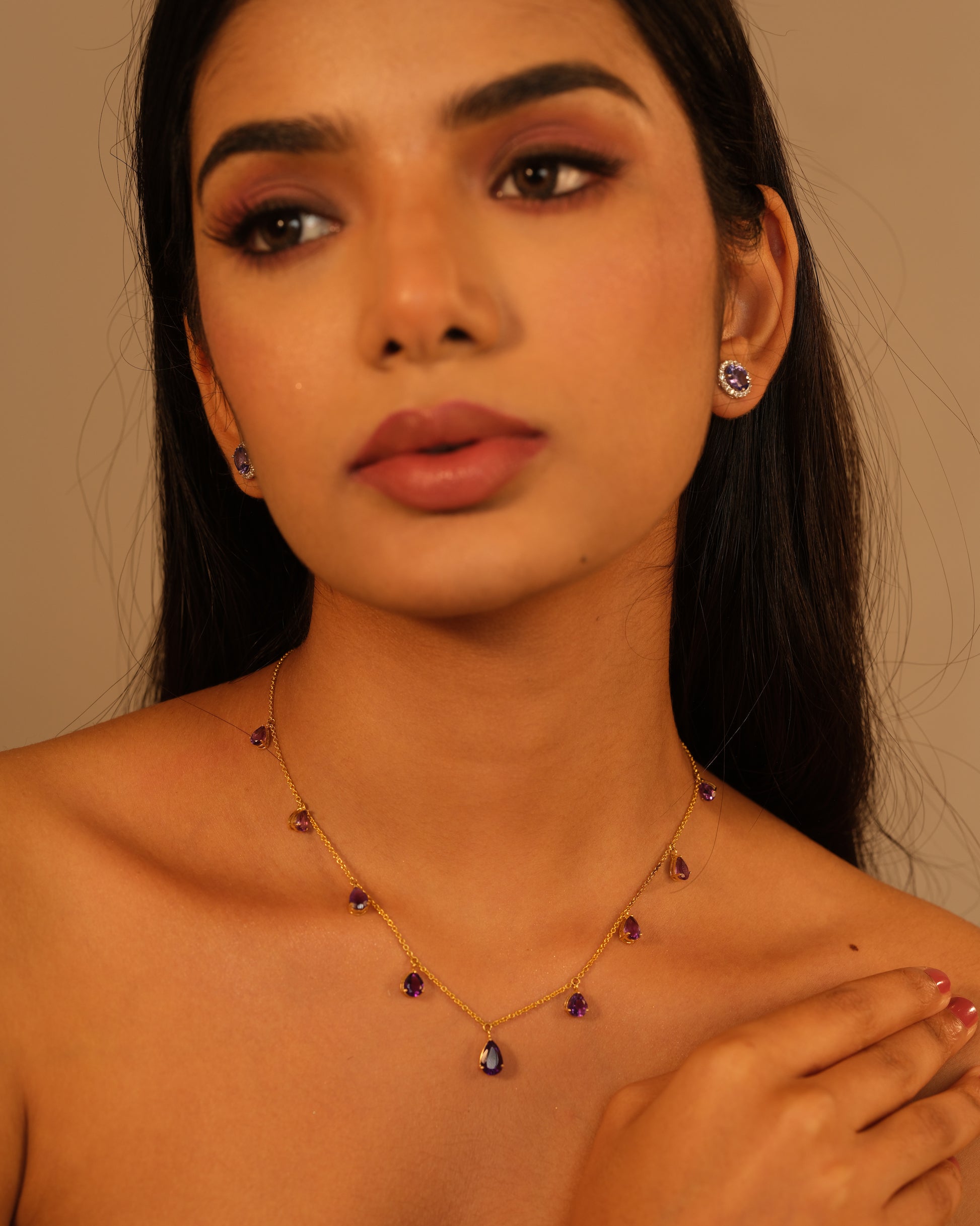 Dangling amethyst gemstones on a graceful chain. The deep purple hues of the Amethyst, known for their association with calm, clarity, and inner peace, add a touch of refined beauty to any look. Each gemstone is carefully set to dangle delicately, catching the light and creating a mesmerising, subtle sparkle with every movement. The minimalist chain design complements the rich tones of the Amethyst, making the necklace a versatile yet striking choice for both everyday wear and special occasions.